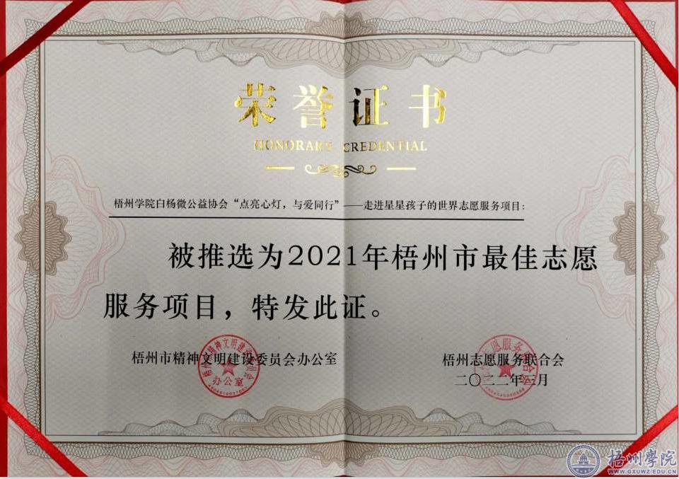 近日,根据《关于表扬2021年度梧州市学雷锋志愿服务先进典型的通报》(梧文明办〔2022〕5号),我校商学院团委·青年志愿者分会服务队被评为年度最佳志愿服务组织,白杨微公益协会“点亮心灯,与爱同行——走进星星孩子的世界”志愿服务项目被评为年度最佳志愿服务项目。