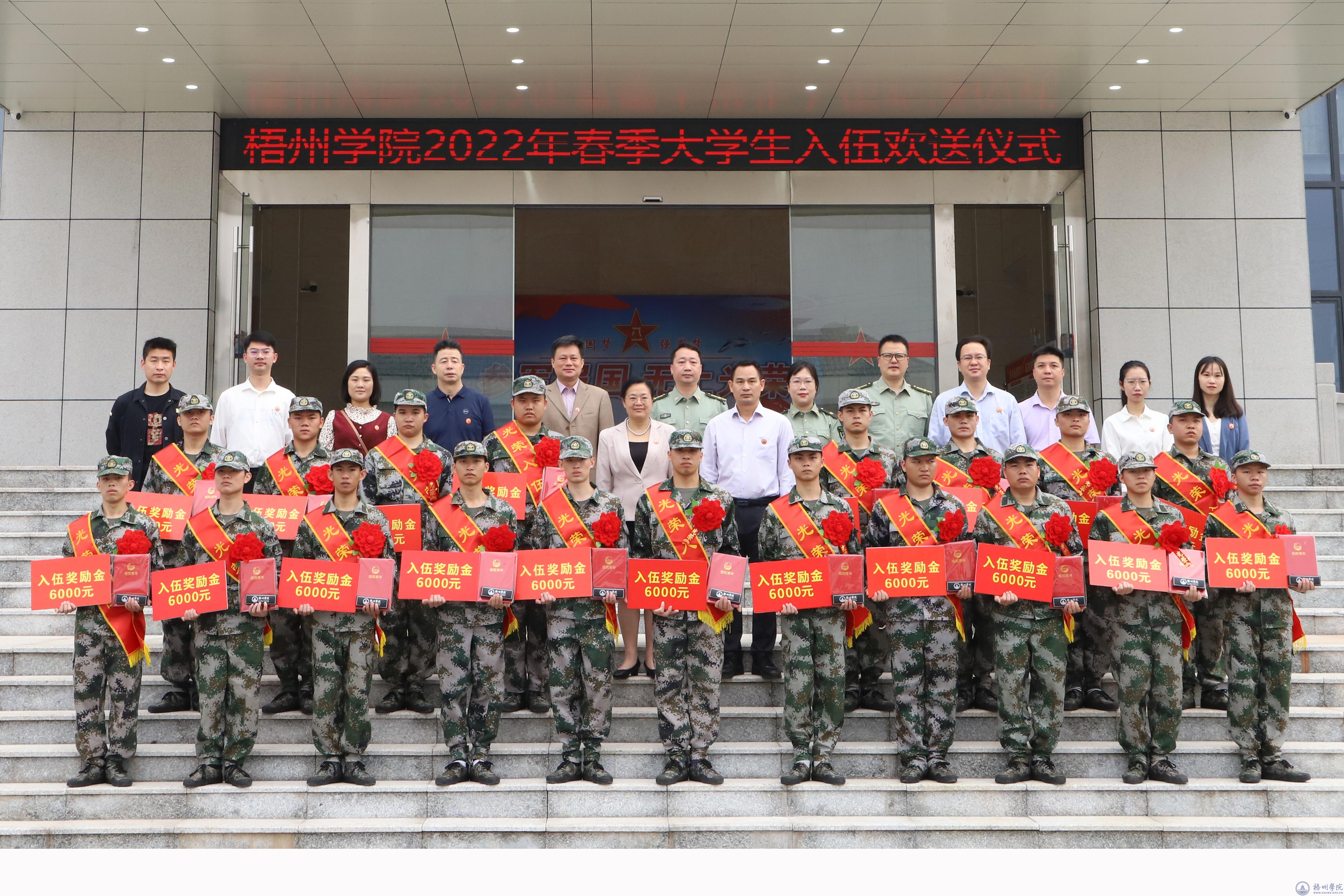 3月15日上午,梧州学院2022年春季大学生入伍欢送仪式在梧州市万秀区武装部举行。学校党委书记韦仕珍,副校长范生汝,学校武装部及应征入伍学生所在学院的负责人、辅导员,19名应征入伍学生参加了仪式。