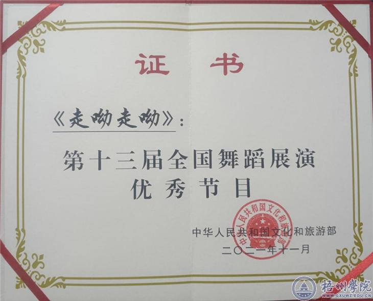 近日,文化和旅游部传来喜报,我校原创舞蹈《走呦走呦》荣获第十三届全国舞蹈展演优秀节目。