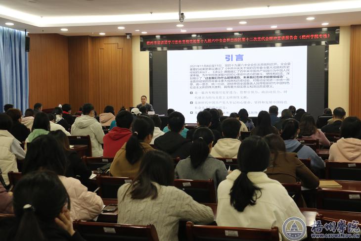 12月23日,梧州市宣讲团到我校举行学习贯彻党的十九届六中全会精神宣讲报告会。梧州市宣讲团成员、市委党校副校长田新元副教授在明科楼一楼报告厅为我校机关教职工、各二级学院师生代表100多人作题为《党的十九届六中全会精神解读》宣讲报告。 会上,田新元围绕“党的十九届六中全会的重大意义、党的十九届六中全会的重要内容、党的十九届六中全会的重要启示”三个方面对十九届六中全会精神作了解读,指出《中共中央关于党的百年奋斗重大成就和历史经验的决议》通篇融汇了百年来中国共产党践行为中国人民谋幸福、为中华民族谋复兴的初心使命所进行的奋斗、牺牲和创造,深刻揭示了“过去我们为什么能够成功、未来我们怎样才能继续成功”。他从历史逻辑、现实逻辑阐释了全会的重大意义;从党的百年奋斗的一个历史主题、党的百年奋斗的四个历史时期、新时代的历史性成就和历史性变革、党的百年奋斗的五大历史意义、党的百年奋斗的十条宝贵经验详实介绍了全会的重要内容;从战略定力、战略思路、依靠力量、组织保证、后备力量方面谈了学习全会精神的启示。号召全体党员深入学习贯彻党的十九届六中全会精神,把思想和行动统一到全会精神上来,增强“四个意识”、坚定“四个自信”和做到“两个维护”。
