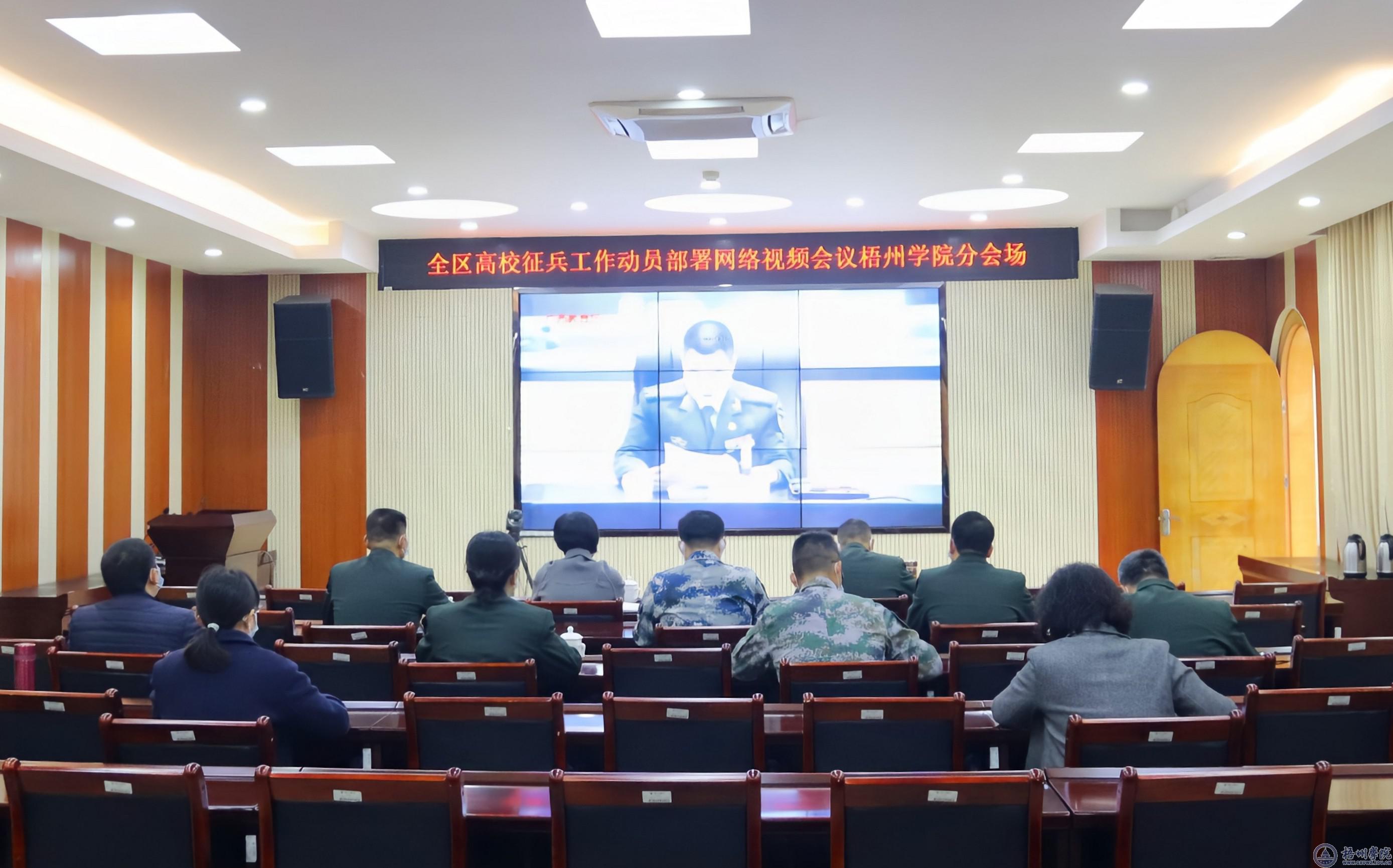 又讯,在动员会前,全区高校征兵工作动员部署网络视频会议梧州学院分会场在七楼视频会议室召开。会上,自治区征兵办公室、广西军区动员局副局长谢锋总结了2021年征兵成果,肯定了梧州学院等12所本科院校为入伍毕业生开通答辩绿色通道,保障征兵工作的做法。他在作2022年征兵工作部署时强调:做好准备、增强宣传力度、提高服务水平。自治区教育厅二级巡视员、高校学生处处长汪维对征兵工作部署提出要求:提高政治站位、聚焦主体、将宣传工作落细落实,强调要密切军地配合、理顺工作关系、注重风险防控。