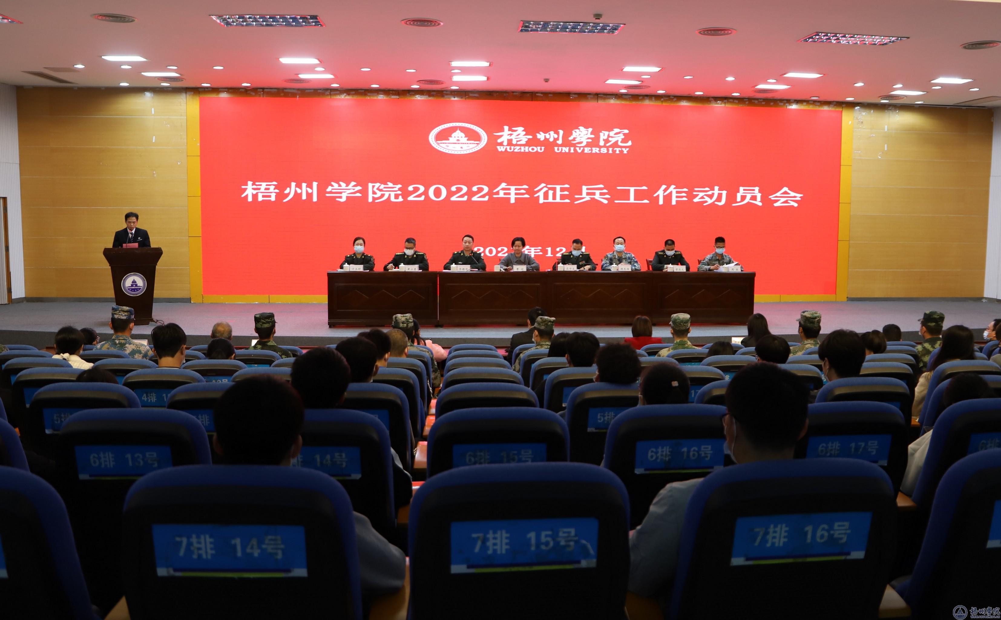 12月24日,学校2022年征兵工作动员会在明理楼学术报告厅召开,梧州军分区副司令员左平生,学校党委副书记曹迎出席会议。梧州军分区动员处处长韩龙海、万秀区武装部部长曾庆文,学校武装部、各二级学院分管学生工作负责人,2022届毕业生带班辅导员和退役大学生、意向参军入伍的学生参加会议。动员会由学校武装部部长李德华主持。