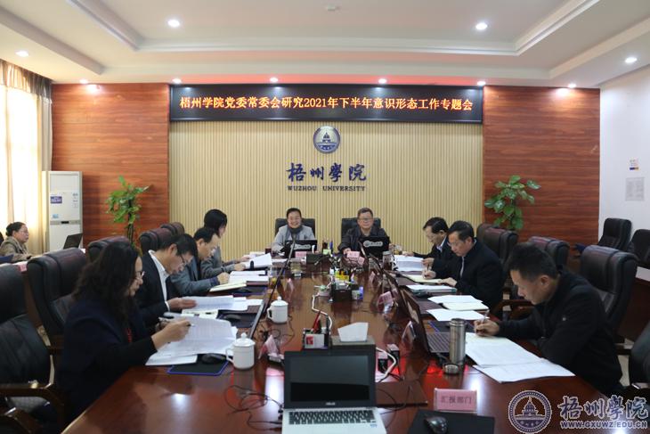12月24日,学校党委在明理楼八楼第二会议室召开常委会,专题研究学校2021年下半年意识形态工作的有关问题。会议由校党委书记韦仕珍主持。杨奔、曹迎、邱房贵、梁业华、麻新纯、黄健武、陈健萍等学校党委常委、校领导出席会议。