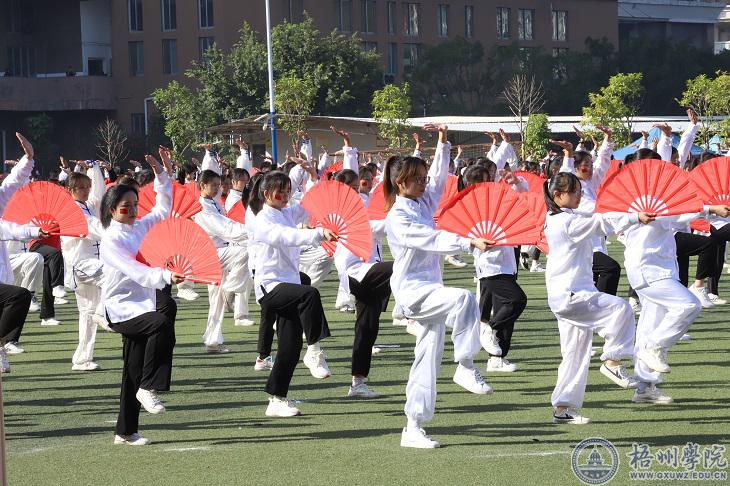 开幕式后,各二级学院480余名学子进行太极功夫扇团体赛,他们身穿白色太极服,手持红色功夫扇,以整齐划一的动作展现出传统武术的磅礴气势及梧院学子积极向上的精神风貌。