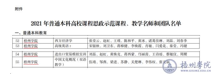 根据《自治区教育厅关于公布2021年普通本科高校课程思政示范课程名单的通知》(桂教高教〔2021〕59号),经自治区教育厅专家遴选评审,我校遴选、推荐的《西方经济学》《高级英语2》《进出口贸易实训》和《中国文化概况》4门课程被确定为广西2021年普通本科高校课程思政示范课程,张堂云、宋银秋、刘磊和伍靖被确定为广西2021年普通本科高校课程思政教学名师,其所在团队被确定为广西2021年普通本科高校课程思政教学团队。