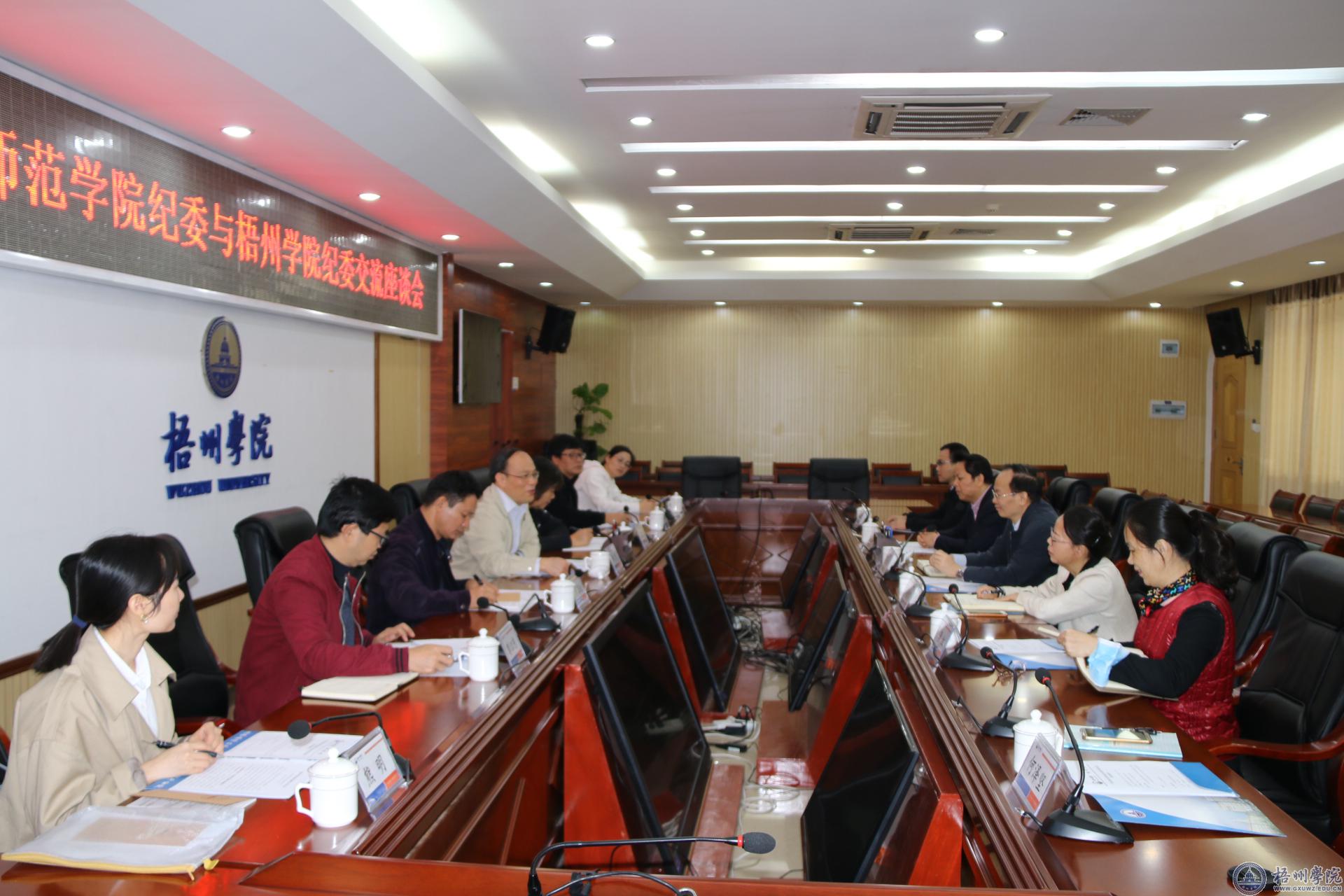 10月22日,广西民族师范学院党委常委、纪委书记邹勇一行7人到访我校,双方就纪检监察工作进行座谈交流,我校党委常委、纪委书记梁业华参加座谈交流会。