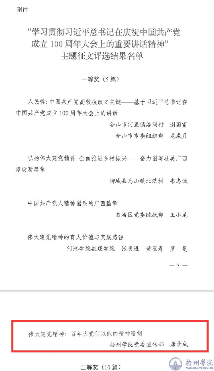 今年7月至8月,广西党的建设研究会在全区举办了“学习贯彻习近平总书记在庆祝中国共产党成立100周年大会上的重要讲话精神”主题征文活动。本次征文活动在全区共征集稿件261篇,经专家评审组认真评审,共评选出30篇优秀征文,其中一等奖5篇,二等奖10篇,三等奖15篇。我校教师唐景成撰写的文章《伟大建党精神:百年大党何以能的精神密钥》获得一等奖。