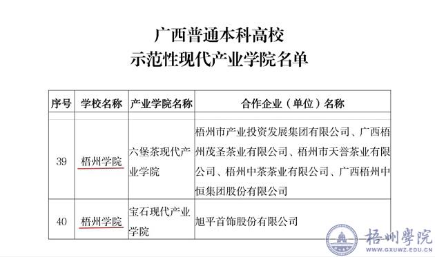 近日,根据《自治区教育厅自治区工业和信息化厅关于公布广西普通本科高校示范性现代产业学院名单的通知》(桂教高教〔2021〕50号),我校六堡茶现代产业学院和宝石现代产业学院被确定为广西普通本科高校示范性现代产业学院。