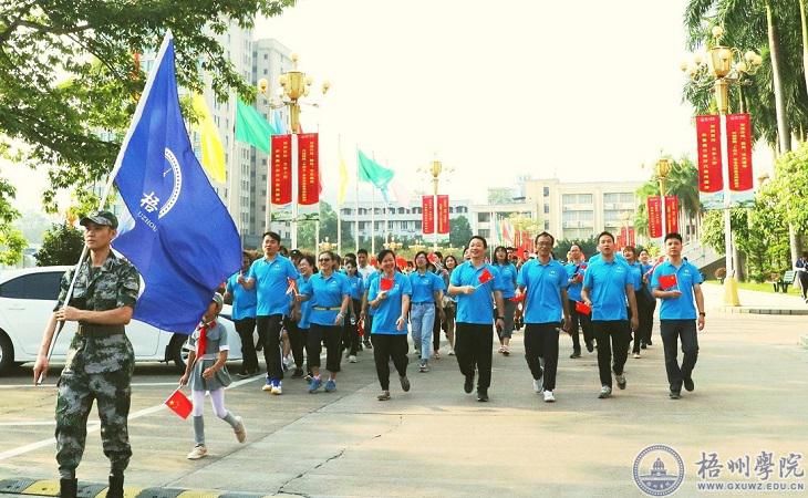为庆祝中华人民共和国成立72周年,展现我校师生健康阳光的精神面貌。10月1日上午,我校在田径场举行以“不忘初心跟党走,砥砺奋进新征程”为主题的国庆节升国旗仪式暨环校健步走活动。学校党委副书记曹迎出席活动,学生工作部(处)、校团委、体育教学部,各二级学院分管学生工作的负责人、师生代表1800多人参加活动。活动由学校学生工作部(处)部(处)长李德华主持。 学校国旗护卫队踏着整齐的步伐,将国旗护送到升旗台前,管乐队鼓乐齐鸣、奏响国歌,国旗冉冉升起,在场人员行注目礼,唱中华人民共和国国歌。 升旗仪式上,电子与信息工程学院2020级通信1班林富鸿作了以“不忘初心跟党走、砥砺奋进新征程”为主题的发言。他说:“新时代赋予青年新的使命,我们要从前辈手中接过建成社会主义现代化强国,实现中华民族伟大复兴的神圣接力棒,做社会力量中最积极、最有生气的力量。” 党委副书记曹迎作国旗下讲话。她表示,今年是中国共产党的百年华诞,是“十四五”开局之年。新中国成立72周年以来,我们的祖国比历史上任何时期都更加接近实现中华民族伟大复兴的目标。她希望在实现中华民族伟大复兴目标过程中,同学们可以做到两点要求:一是继续坚定理想信念,不忘初心跟党走。争做优秀梧院人,勇担党和人民赋予的历史使命和时代重任,将个人前途与国家民族的命运紧紧相连,激发蓬勃朝气,彰显青春正能量;二是不断学习创新,砥砺前行新征程。迎接时代新挑战,成长为具有健康心智体魄,良好人文素质,系统理论知识,扎实实践能力的高素质人才,为实现中华民族伟大复兴贡献青春力量。 升旗仪式后,开始环校健步走活动,本次环校健步路线从田径场出发,依次经过A4路口、明科楼、明理楼、体育馆、网球中心、北片区、风雨球场、图书馆、图书馆环山道、最后回到田径场集合,合影留念。活动中各队伍井然有序,手舞五星红旗,各组织、社团代表队高喊口号、欢唱赞歌,气氛热烈,形成一道靓丽的校园风景线。 退役军人学生代表、大数据与软件工程学院2021级数学1班陆泽钦说:“在这次活动中,我和我的战友们再次相聚,我们共唱军歌,喊着口号,齐步前行,勾起我们历历在目的军旅回忆。人虽然退伍了,但我们的爱国之心永不退伍,若有战,召必回。” 校艺术团学生代表、文学与传媒学院2020级新闻2班董冠珠说:“很荣幸参与到健步走活动。这次全校性的活动我觉得非常有意义,迎着太阳,感受祖国的朝气蓬勃,我们的心也激动不已。” [文:大学生通讯社 周雪芳/编辑刘永琴/图:郝金霞]
