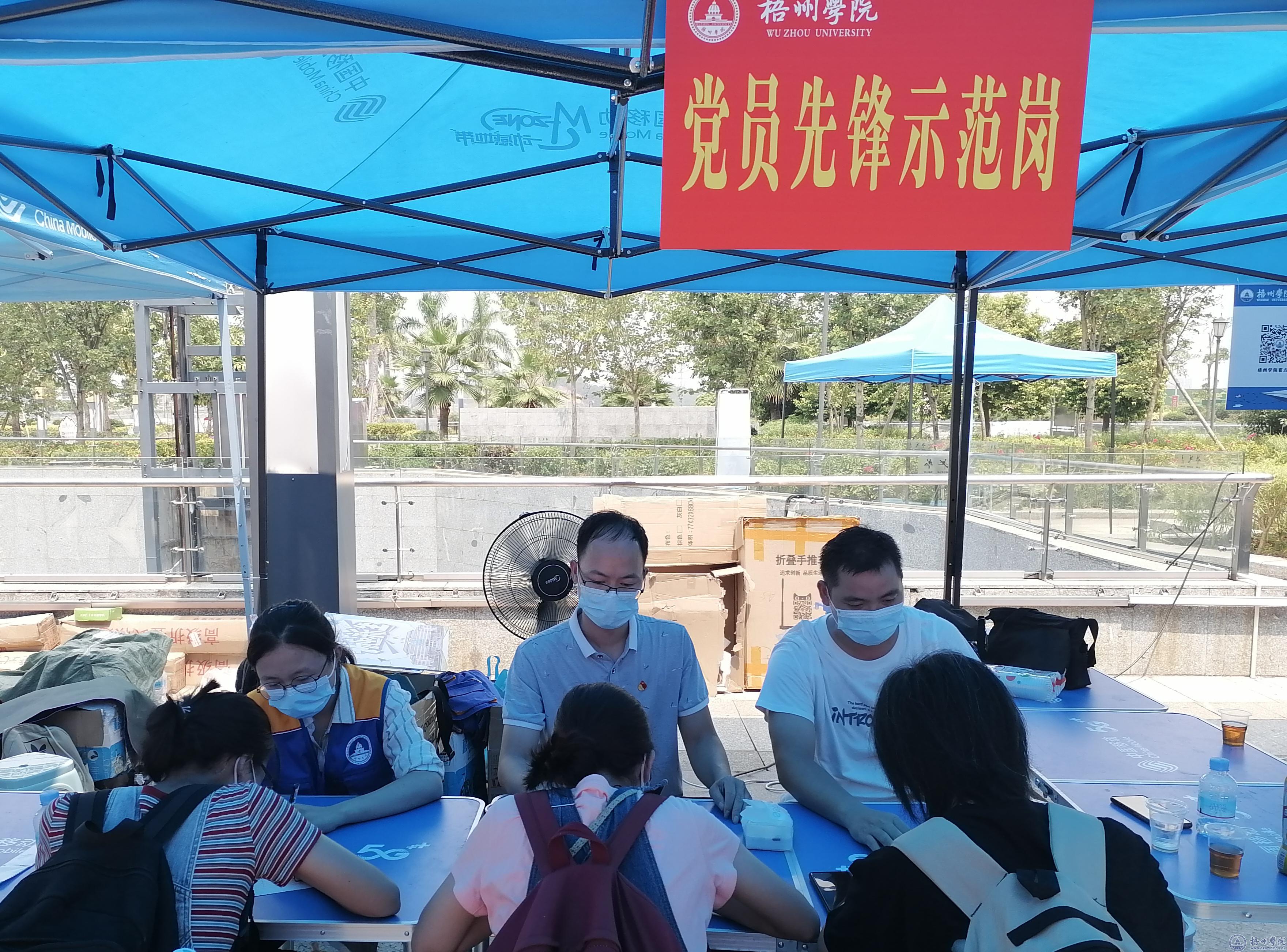 迎新当天骄阳似火,全校师生党员以热情饱满的姿态迎接新生和家长们的到来。各级党组织在车站接站点、校内体温检测点、相关部门手续办理点、二级学院大本营等服务点共设置党员先锋示范岗20多个,师生党员们主动亮出身份,带头全力协助做好新生入学报到后勤保障各项工作。校园内处处可见身着红色制服、佩戴党徽的师生党员们忙碌的身影,他们主动为新生和家长们答疑解惑,做好检测体温和交通引导,提供免费饮用水和座位休息,协助搬运行李等。教务处、财务处、学生工作处为新生提供“一站式”服务,优化办事流程,以便新生快速办好入学注册、缴费等各项手续。