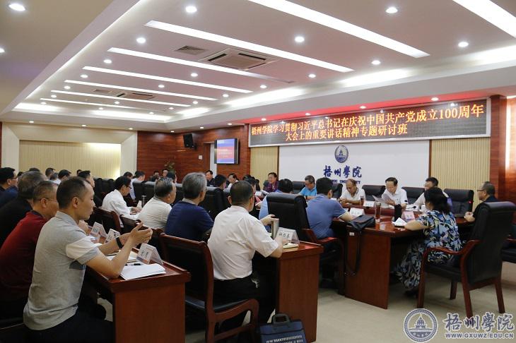 9月17日下午,学校党委在明理楼第一会议室召开学习贯彻习近平总书记在庆祝中国共产党成立100周年大会上的重要讲话精神专题研讨班。学校党委书记韦仕珍主持会议,校领导杨奔、曹迎、玉振明、邱房贵、梁业华、麻新纯、宾月景,学校党委理论学习中心组成员、学校中层正职干部参加学习。