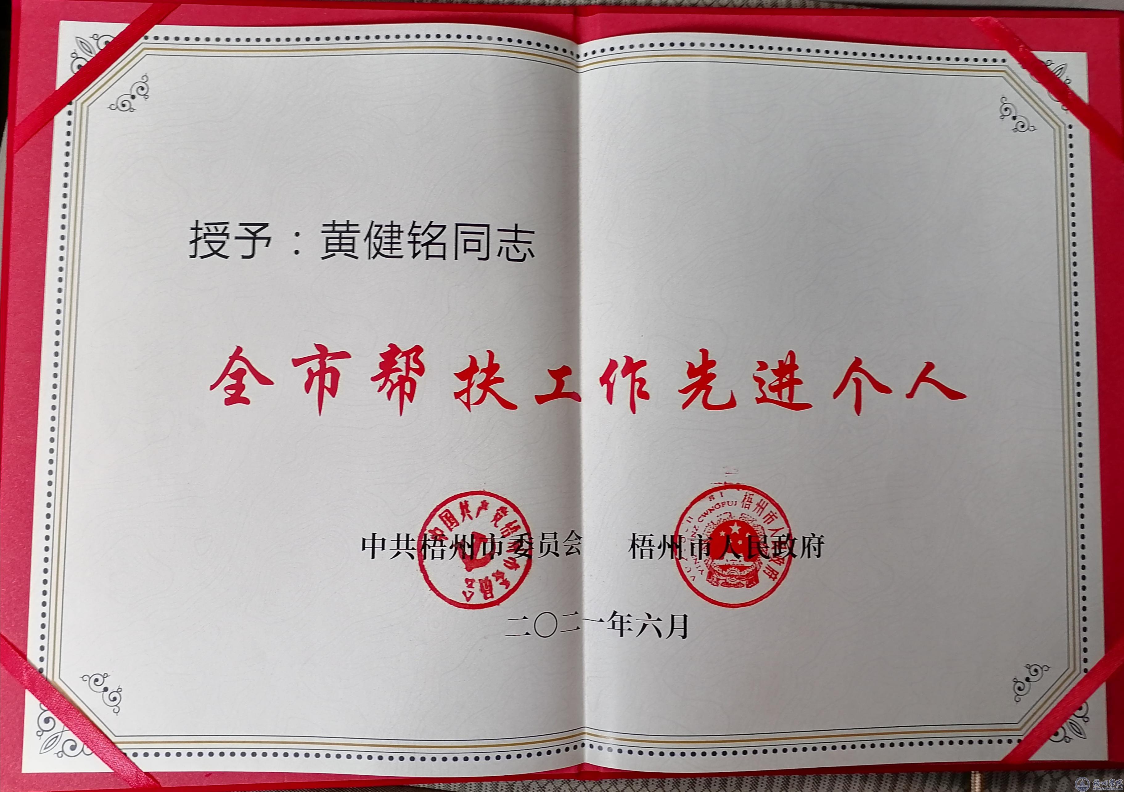 近日,梧州市委、市政府表彰了一批来自全市各行各业、各条战线,在脱贫攻坚工作中作出了不平凡业绩的集体和个人,全市共有50个集体和80名同志获得表彰。我校黄健铭同志在本次表彰中荣获“全市帮扶工作先进个人”称号。
