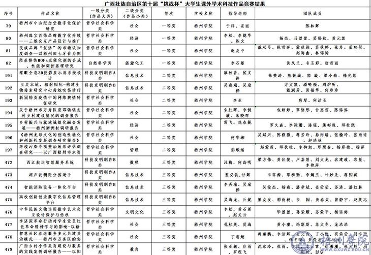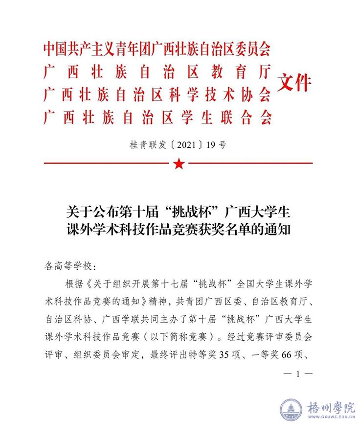 根据《关于公布第十届“挑战杯”广西大学生课外学术科技作品竞赛获奖名单的通知》(桂青联发〔2021〕19号)文件精神,我校在第十届“挑战杯”广西大学生课外学术科技作品竞赛中共获得一等奖4个, 二等奖7个,三等奖8个,学校荣获“优秀组织奖”。