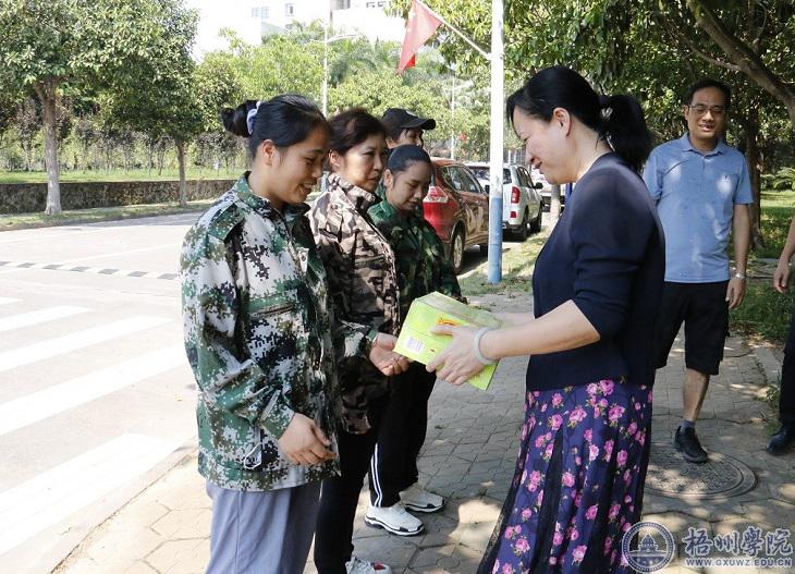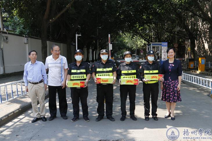 7月28日下午,学校党委副书记、工会主席曹迎对在暑假期间坚守工作岗位的校卫队员、环卫职工和宿舍管理员进行慰问,送去清凉饮料一批,同时给在高温期间坚守工作的同志们送上组织的慰问之情。