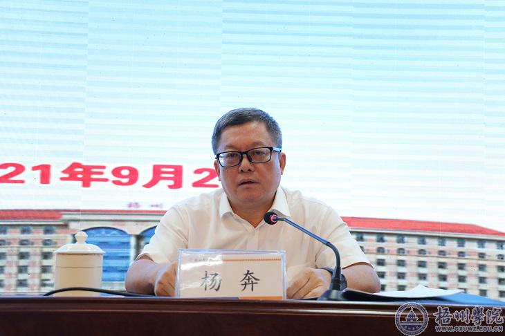杨奔校长以《稳中求进为学校“十四五”发展开好局起好步》为题对秋季学期重点工作作布置。结合教育部2021年重点工作推进会精神,杨奔校长从“深刻理解稳中求进,为学校‘十四五’开好局起好步的逻辑内蕴”“准确把握新形势,增强加快发展紧迫感,在硕点培育建设上实现新突破,切实为学校‘十四五’开好局起好步”“稳中求进,聚焦重点精准发力,用新作为推动学校‘十四五’开好局起好步”三个方面对学校2021年秋季学期的工作节奏、目标方向、工作痛点难点、工作抓手等进行了分析和布置。他指出,“十四五”时期学校将硕士学位授予单位建设作为重大项目和重点任务予以推进,在大力引培博士、继续强化师资队伍建设的同时,全力降低生师比,集全校之力奋勇冲刺硕士学位授予单位建设。他强调,学校要在稳打稳扎做好疫情防控、迎新、意识形态安全等工作的基础上,着力推动博士师资队伍建设、科研工作、教学管理服务、硕士学位授权点培育建设、综合改革、基础设施建设六个方面的“创新求变”工作。