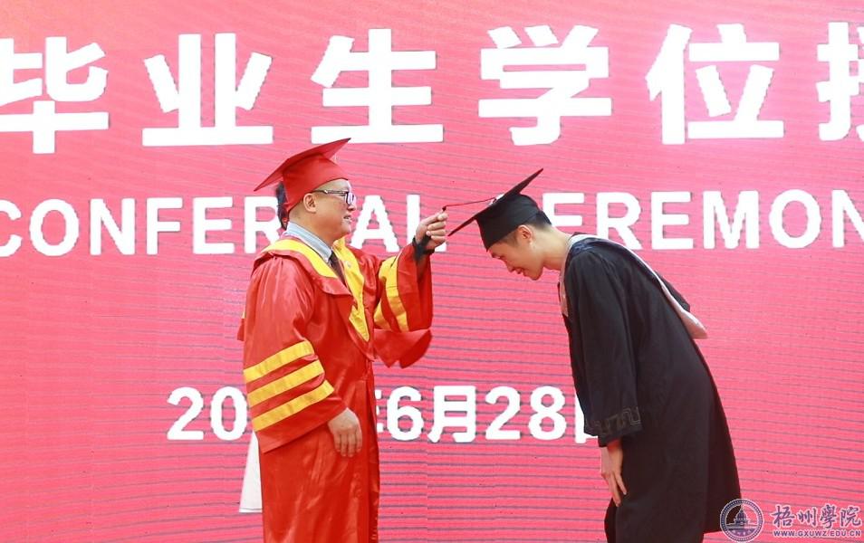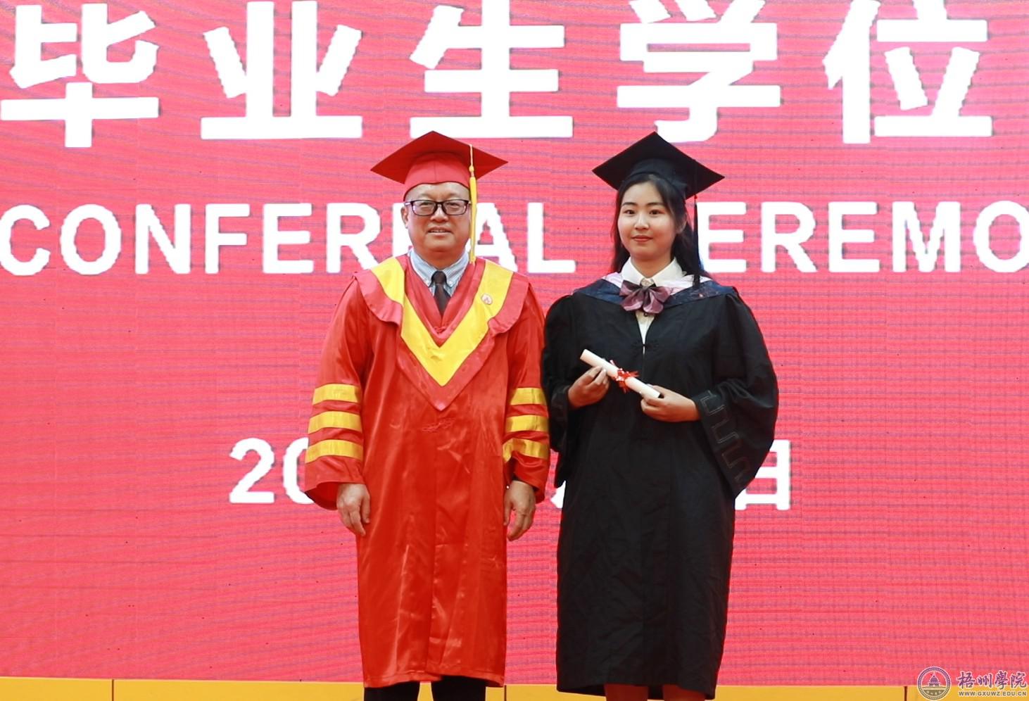 学位授予仪式中,圆满完成大学阶段学习与生活的毕业生,以最灿烂的笑容,逐一接受了杨奔校长对他们的正冠与拨穗之礼,逐一和杨奔校长合影,同这段最美好的青春岁月告别。