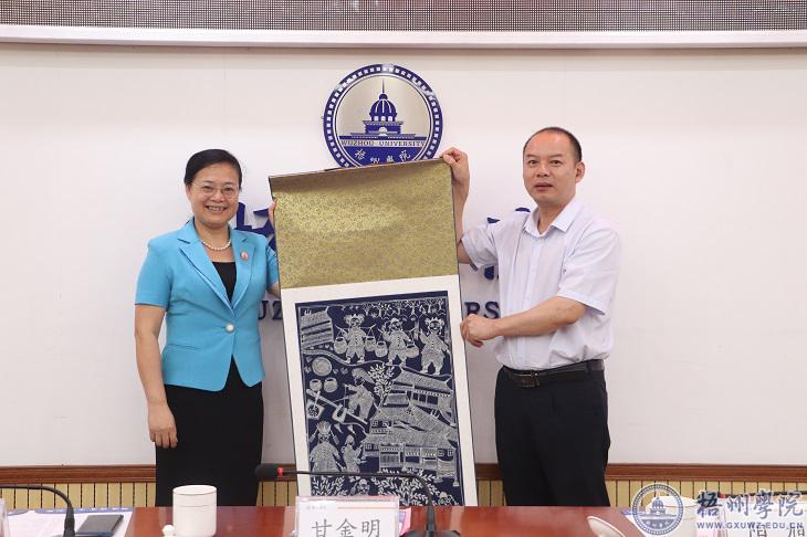 甘金明希望通过考察交流学习先进的管理经验,并代表柳州职业技术学院向梧州学院赠送蜡染画,韦仕珍代表学校接受捐赠。