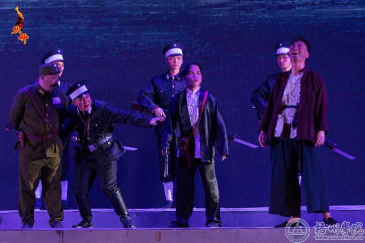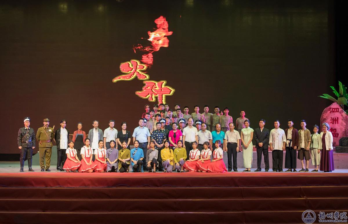 6月16日晚,庆祝建党一百周年红色话剧《火种》在体育馆三楼精彩上演。梧州市委常委、宣传部部长黄恩,梧州市人大常委会副主任徐远洲,梧州市政协副主席韦宁,学校领导韦仕珍、曹迎、玉振明、梁业华、宾月景出席观看现场,梧州市广播电视台、市党员教育中心、市文化广电体育和旅游局、市委教育工作领导小组办公室、市群众艺术馆、市文学艺术界联合会、梧州学院梧州校友会代表,学校中层干部、教工党员、“光荣在党五十年”纪念章获得者代表、学生代表共同观看了话剧。