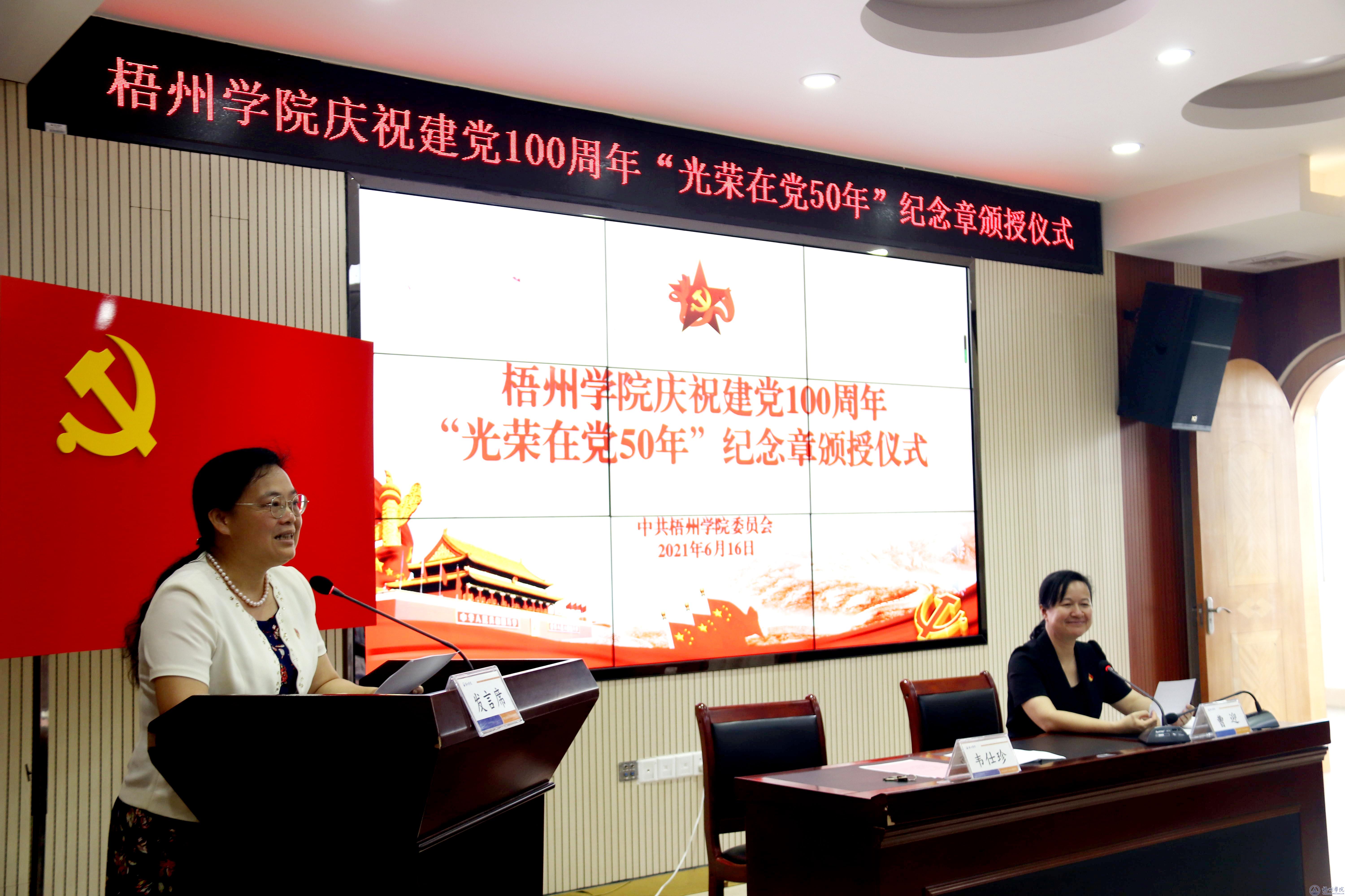 颁授仪式在慷慨激昂的中华人民共和国国歌中拉开序幕。韦仕珍书记代表学校党委为到场的老党员颁授“光荣在党50年”纪念章。