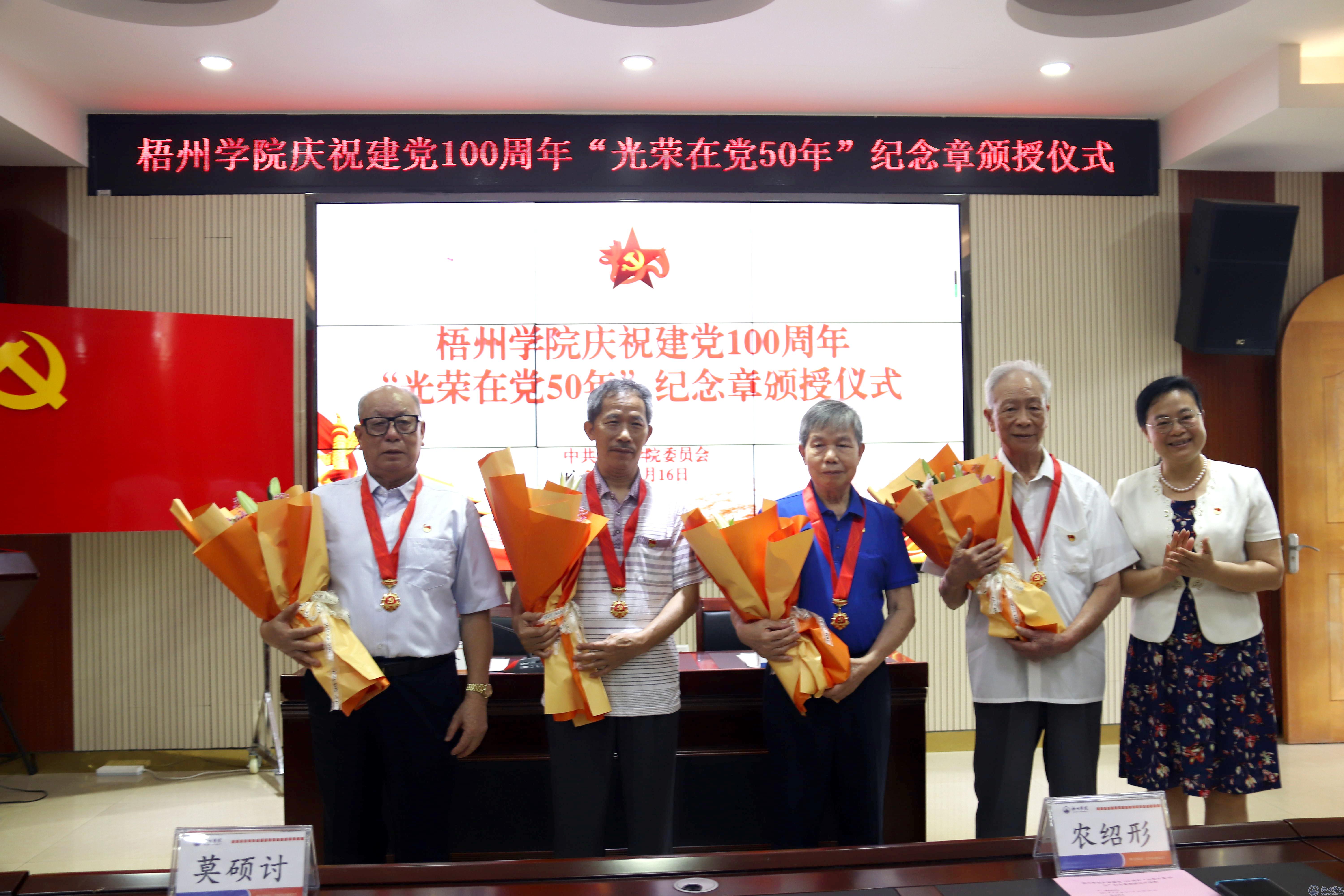6月16日下午,学校庆祝建党100周年“光荣在党50年”纪念章颁授仪式在明理楼七楼视频会议室举行。学校党委书记韦仕珍、党委副书记曹迎,获颁“光荣在党50年”纪念章的老党员代表,校党委办公室、纪委办公室、组织部、宣传部、人事处主要负责人,各二级党组织书记、学生党员代表出席仪式。颁授仪式由曹迎副书记主持。