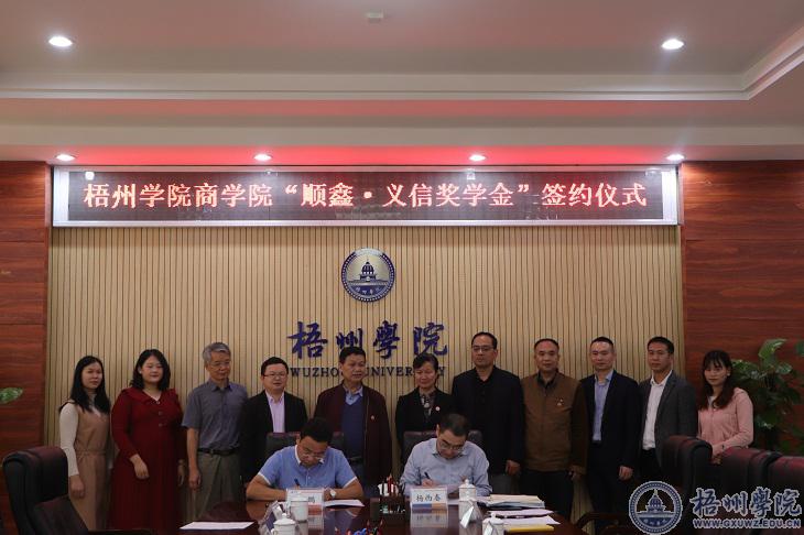 仪式上,商学院院长杨西春和梧州顺鑫网络科技有限公司、广西梧州义信建筑工程有限公司总经理袁鹏在协议书上签字。袁鹏总经理表示,设立梧州学院商学院“顺鑫·义信奖学金”是为了激励广大学子努力学好专业知识,以后报效祖国。