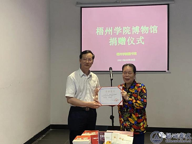 5月8日下午,梧州日报社高级记者陆欣为我校图书馆及商贸文化博物馆捐赠个人著述及藏品,捐赠仪式在西江商贸文化博物馆学术讲演厅举行。学校副校长麻新纯,梧州市科协领导及梧州市退休女干部代表,学校相关部门负责人及师生代表参加了捐赠仪式。