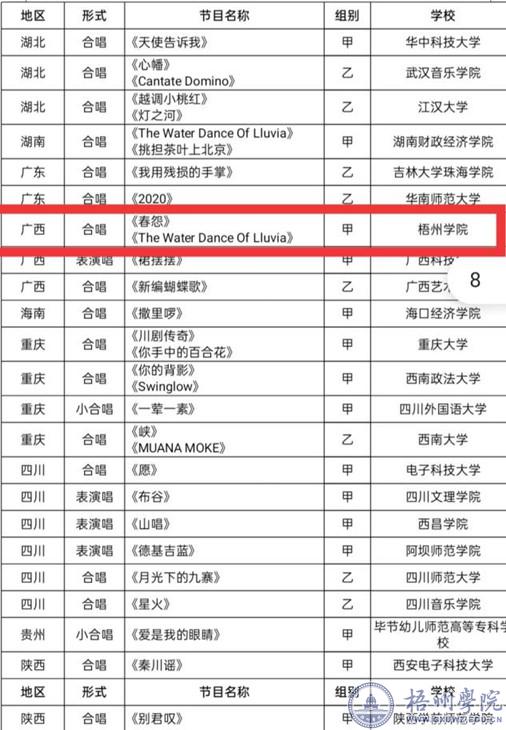 根据教育部办公厅《关于公布全国第六届大学生艺术展演活动艺术表演类节目和大学生艺术实践工作坊现场展演名单以及做好相关组织工作的通知》精神,我校舞蹈《长鼓悠悠》、合唱《春怨》《The Water Dance Of Lluvia》入选全国第六届大学生艺术展演活动现场展演活动,将于5月赴四川成都参加展演。 据悉,全国大学生艺术展演是教育部主导和主办的活动项目,2021年的全国第六届大学生艺术展演活动现场展演阶段共有艺术表演类节目222个,其中声乐节目60个、器乐节目37个、舞蹈节目59个、戏剧节目28个、朗诵节目38个,所有表演类节目来自全国31个省(区、市)、新疆生产建设兵团和香港、澳门特别行政区的高校。