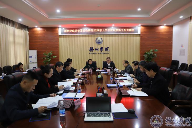 3月22日,学校党委在明理楼八楼第二会议室召开常委会,专题研究学校2021年上半年意识形态工作的有关问题。会议由校党委书记韦仕珍主持。杨奔、曹迎、玉振明、邱房贵、梁业华、麻新纯、黄健武、陈健萍等学校党委常委、校领导出席会议。