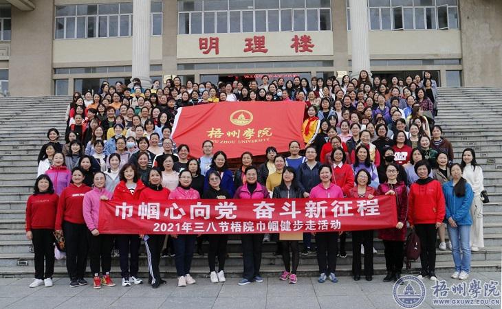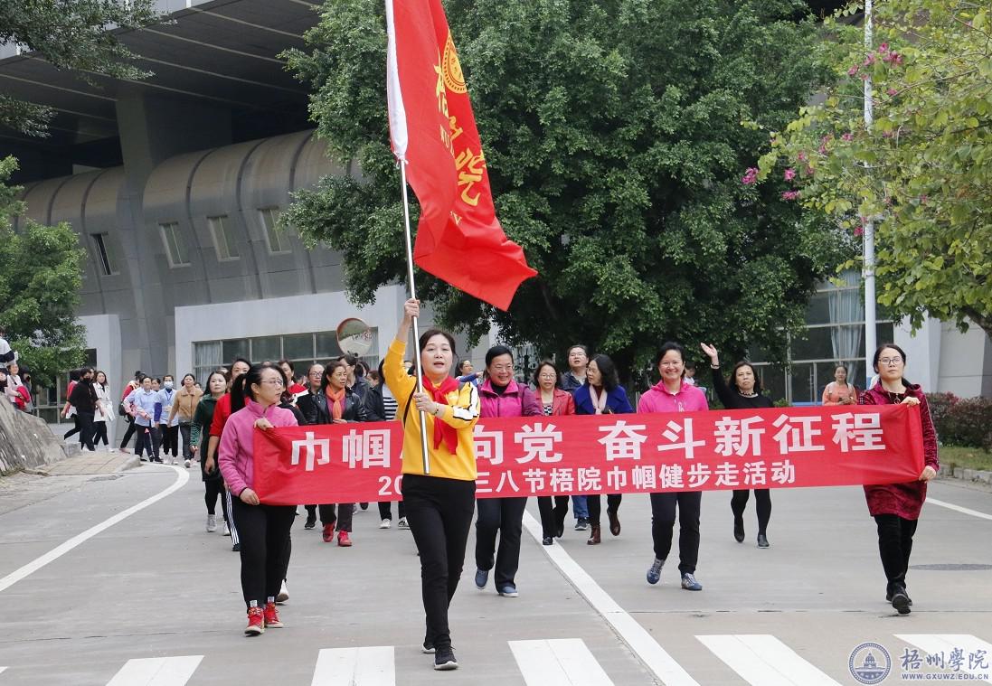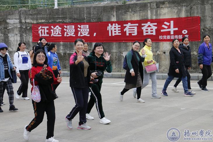 由数百名女教职工参加的环校园健步走活动正式开始。队伍从田径场出发,沿途经过图书馆、风雨球场、北校区、网球场、体育馆等地,回到明理楼前。在印有“梧州学院”logo的红色旗帜带领下,女教职工迈着矫健的步伐行走在校园中,一路欢声笑语,形成一道靓丽的风景线,展示了梧州学院新时代女教职工的巾帼风采。经过体育馆前的新生军训场地,引发了参训学生阵阵问候:“老师好!”“老师辛苦了!”“祝老师节日快乐!”现场气氛热烈而感人。