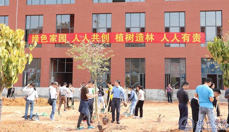 “绿色家园 人人共创 植树造林 人人有责”,植树活动旨在进一步美化校园环境,推进创绿、爱绿、护绿,为建设美丽梧州、美丽校园做出积极贡献。