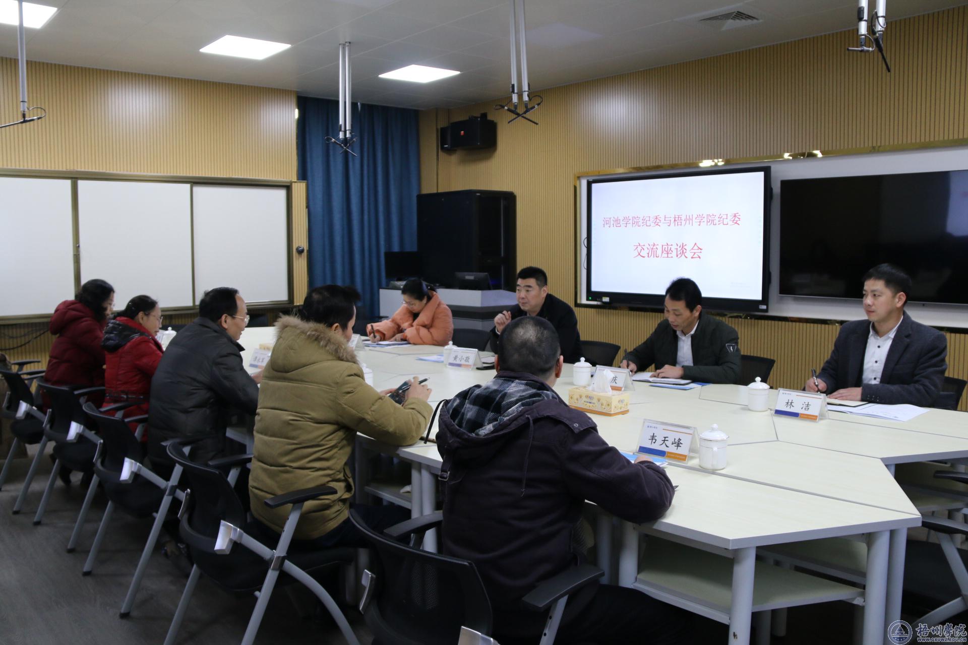 交流会由梁业华主持,纪委办、监察室、巡察办全体干部参加了座谈。交流会后,河池学院黄小敬一行还参观了我校校史馆、标准化谈话室、商学院创新创业教育中心、北片区和博物馆。