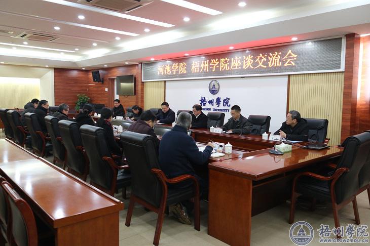 1月11日下午,河池学院校长苗剑、副校长韦文广、总会计师韦兴文、人事处处长苏安、学生工作部部长田光灿到我校交流。校党委书记韦仕珍、校长杨奔、校党委副书记曹迎接待了苗剑一行,学生工作部(处)、人事处、审计处负责人参加了有关活动。