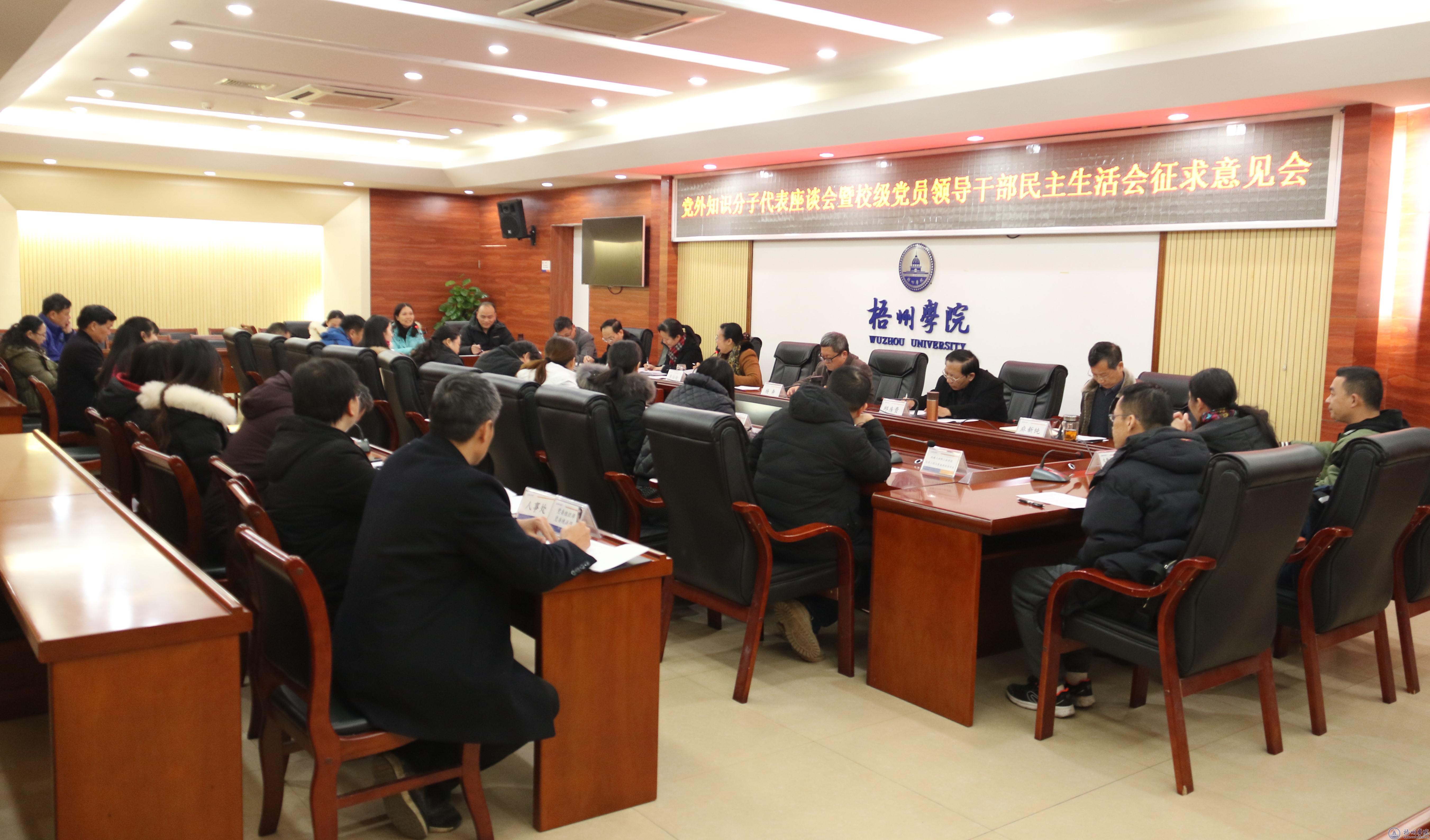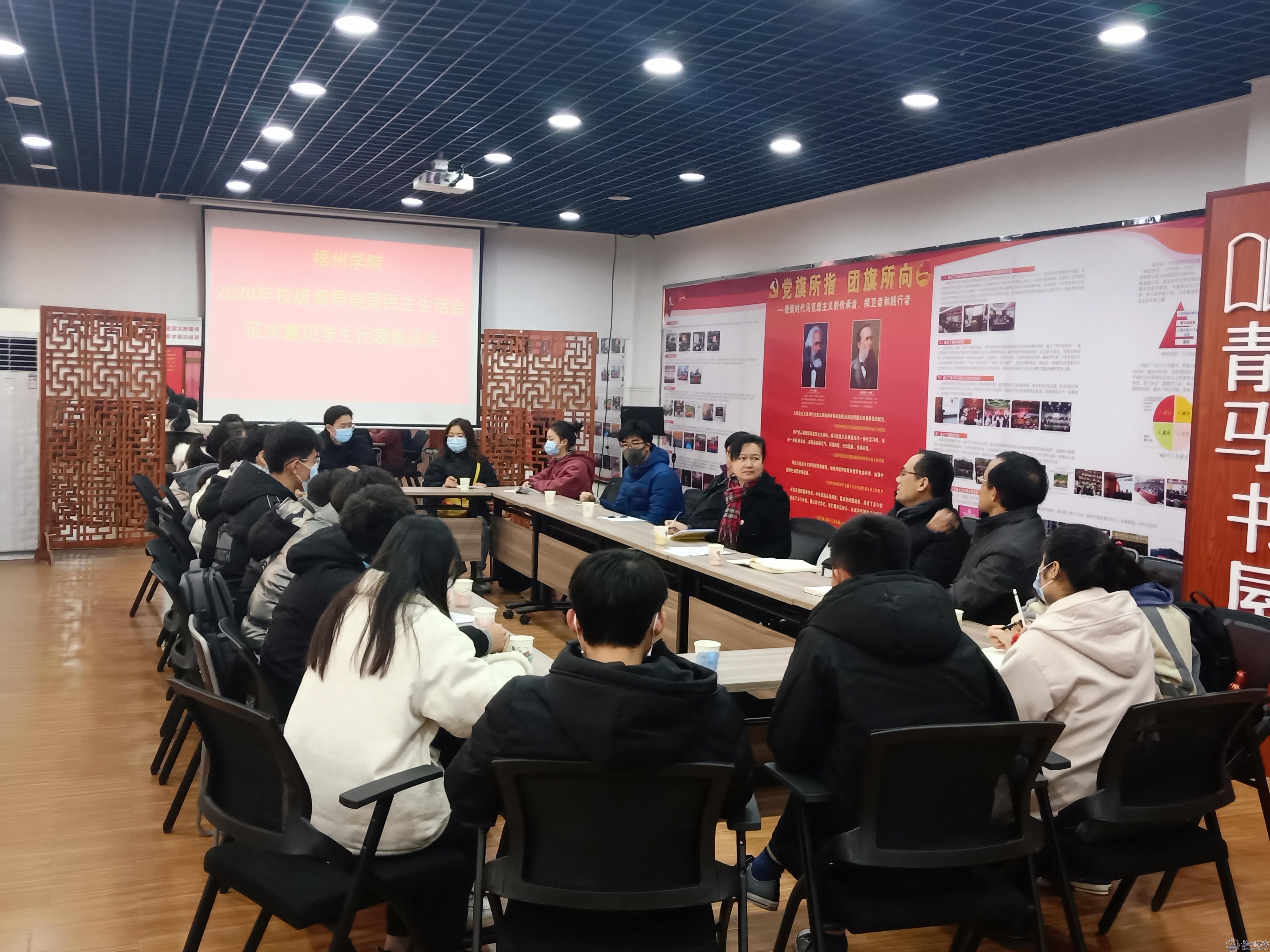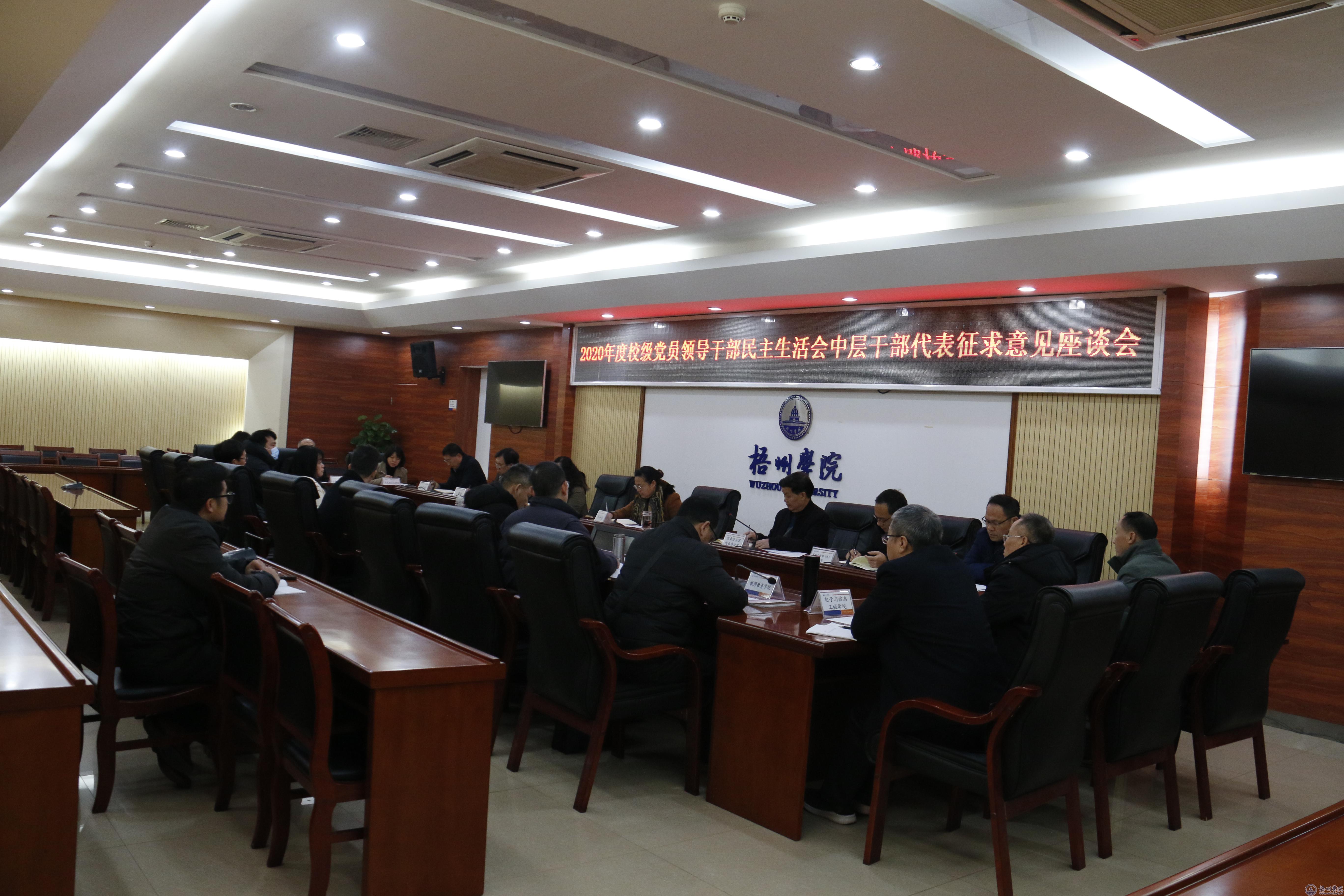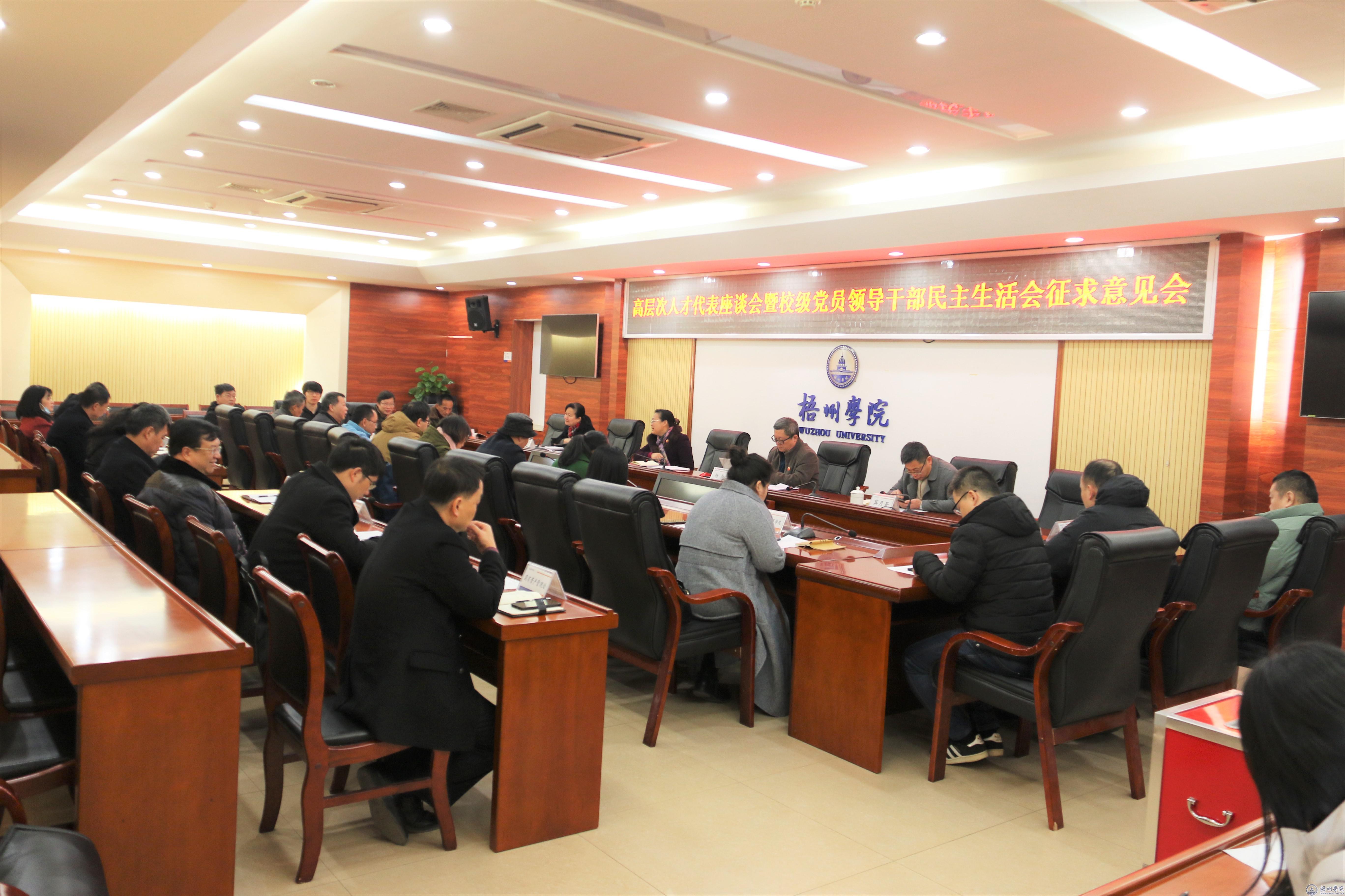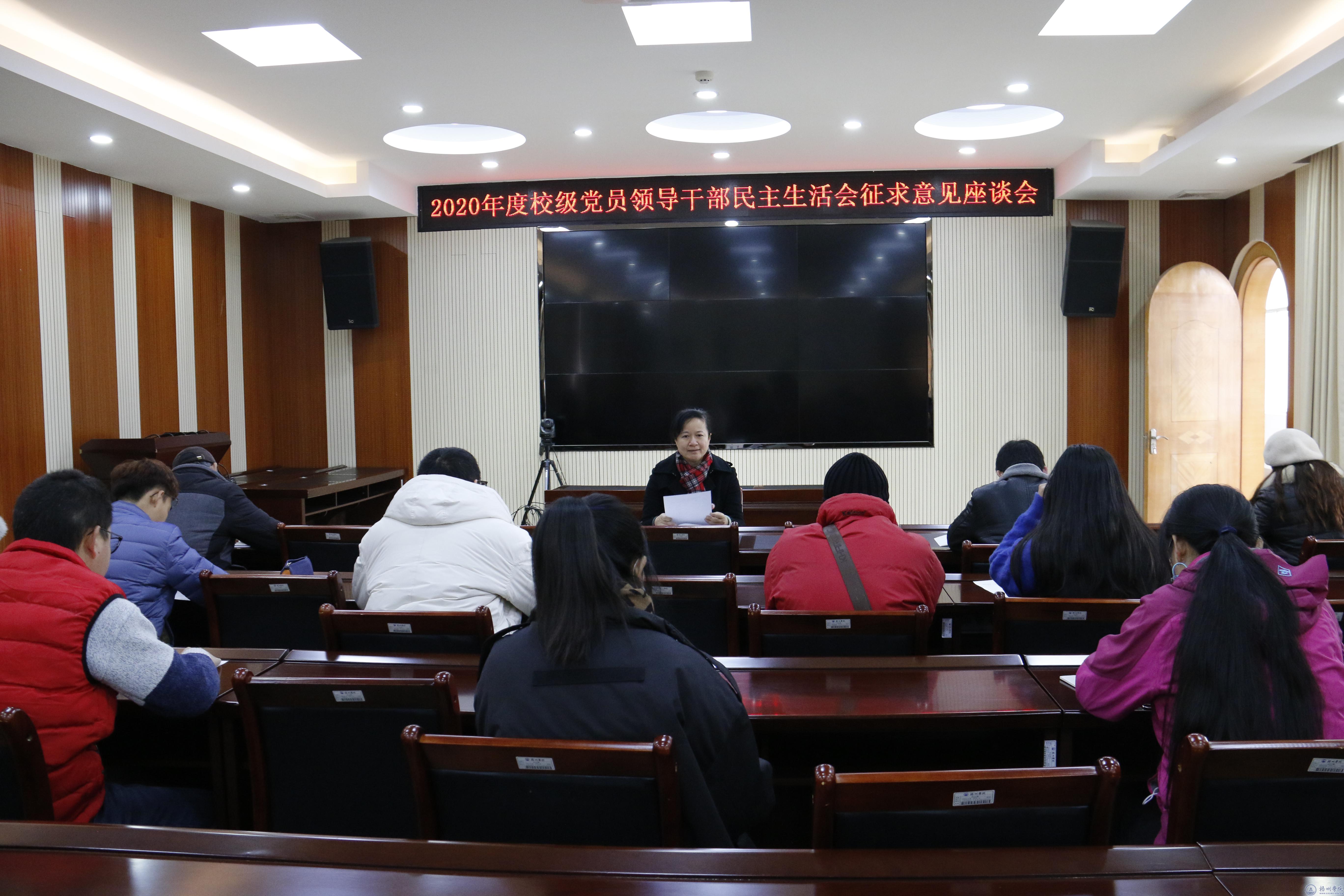 为开好2020年校级党员领导干部民主生活会,1月12日至13日,校党委书记韦仕珍、党委副书记曹迎分别主持召开专题民主生活会系列征求意见座谈会,广泛征求高层次人才代表、中层干部代表、党外知识分子代表、教职工代表、学生代表的意见和建议,学校领导班子成员参加了有关座谈会。
