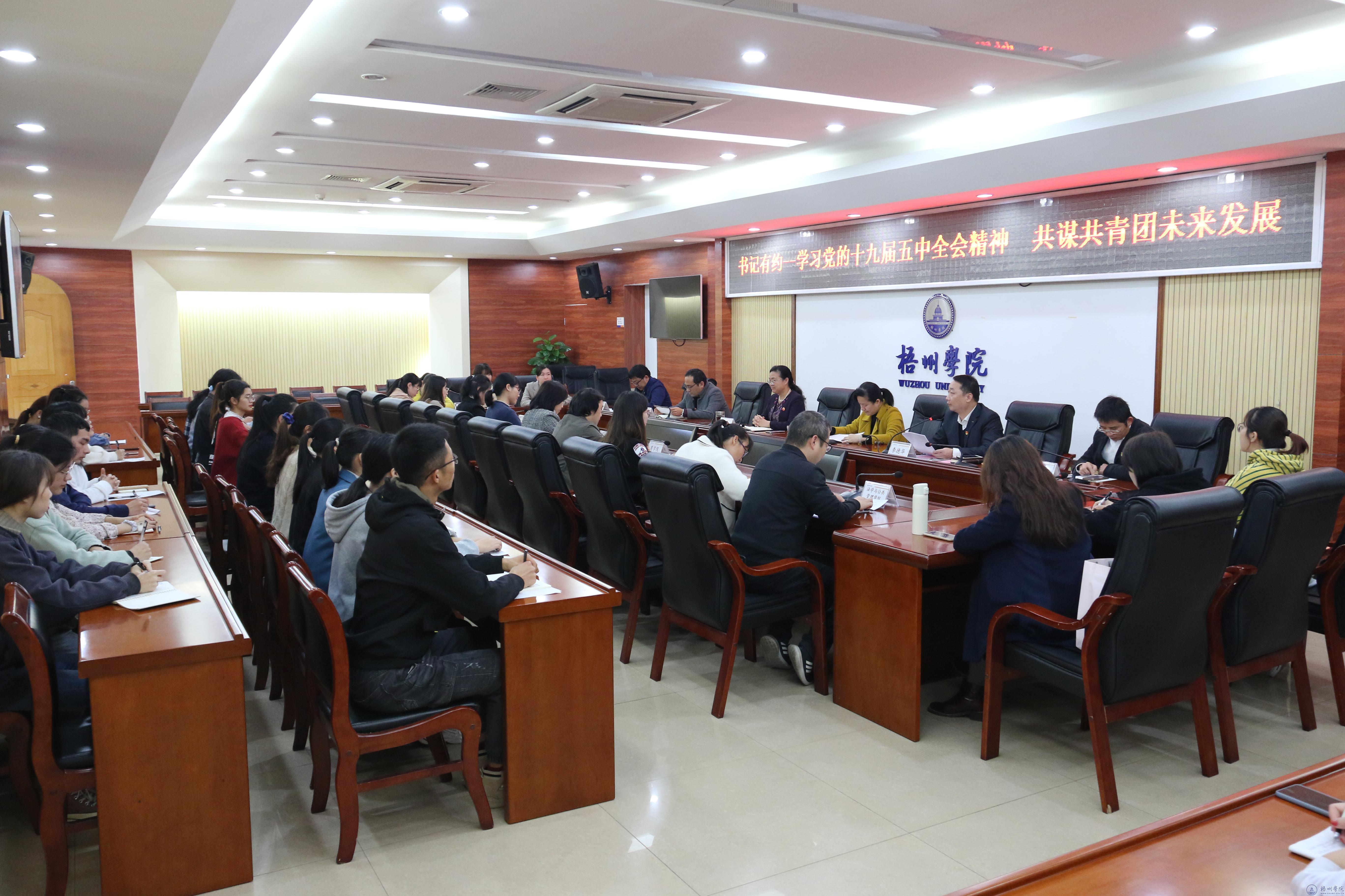 12月29日下午,“书记有约——学习党的十九届五中全会精神 共谋共青团未来发展”座谈会在学校明理楼八楼第一会议室举行。校党委书记韦仕珍、副书记曹迎出席会议。