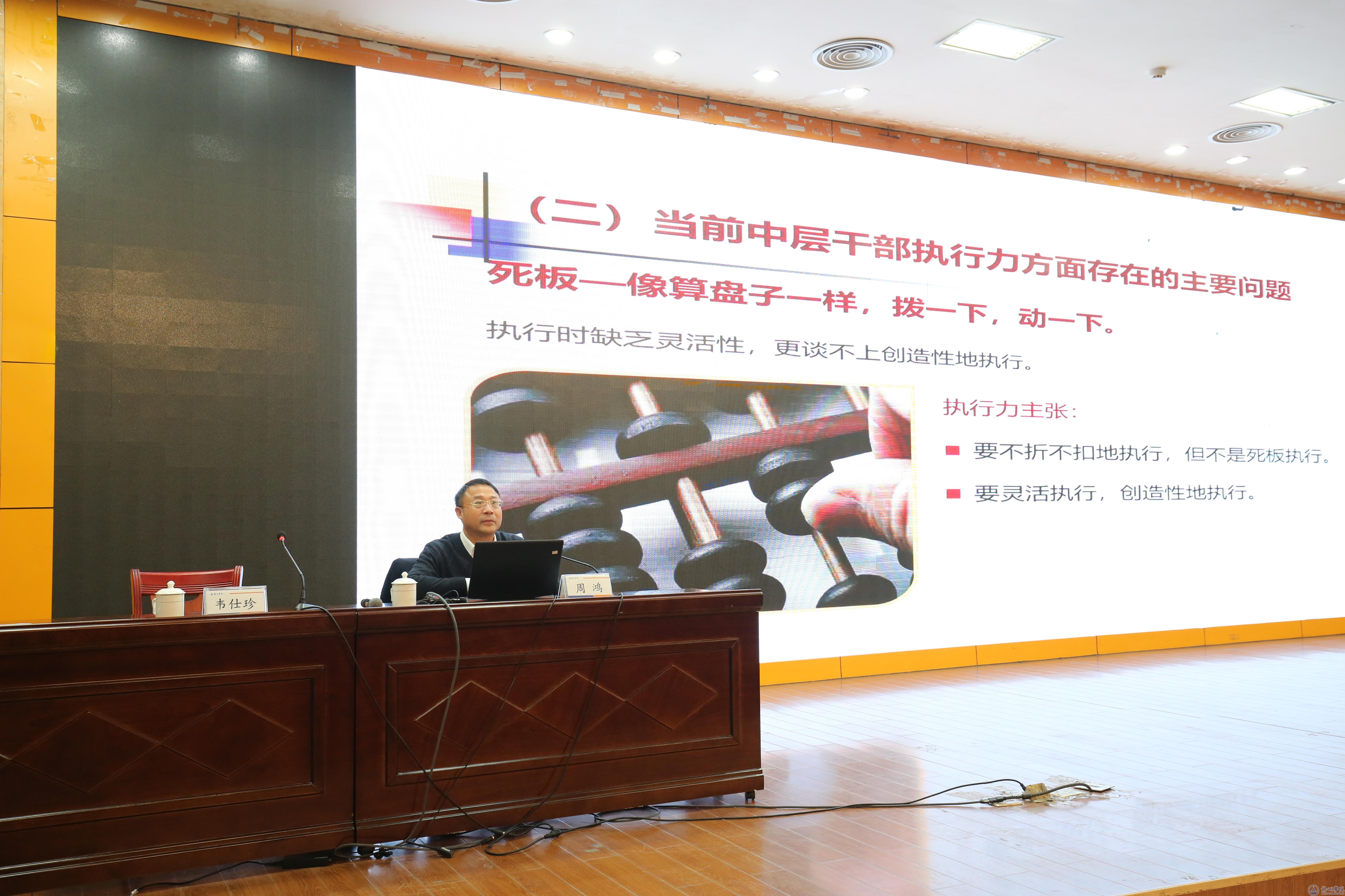 1月4日上午,广西开放大学党委书记周鸿在明理楼学术报告厅作题为《执行力与团队管理》专题讲座。学校全体中层干部、科级干部和专职组织员聆听了讲座。讲座由校党委书记韦仕珍主持。
