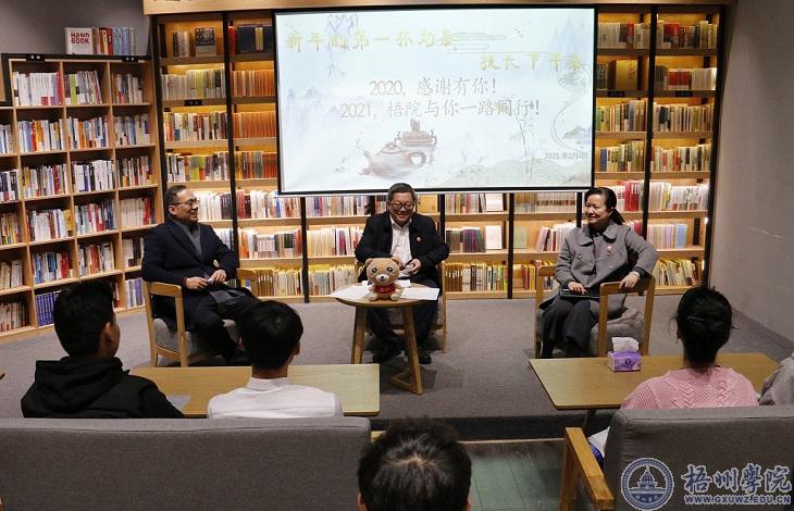 为进一步加强师生联系,增进师生情谊,了解2020级同学到校后的学习生活情况。1月4日下午,我校在独秀书房举行主题为“2020,感谢有你!2021,梧院与你一路同行!”校长下午茶活动。校长杨奔,校党委副书记曹迎出席活动,学生工作部(处)负责人、2020级的新生代表参加活动。