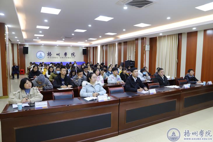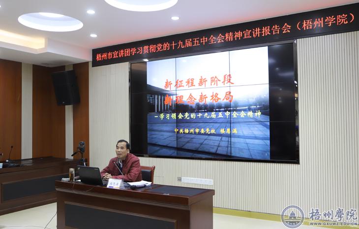 12月14日下午,梧州市宣讲团成员、市委党校市情研究室副主任、副教授楼恩满到我校明理楼七楼视频会议室作《新征程新阶段新理念新格局——学习领会党的十九届五中全会精神》专题报告。报告会由学校党委宣传部副部长唐景成教授主持。 会上,楼恩满从“五年规划”与我国经济社会发展上台阶、新征程、新阶段:从党中央的谋篇布局领会全会精神,新理念、新格局:学懂、弄通、悟透《中共中央关制定国民经济和社会发展第十四个五年规划和二0三五年远景目标的建议》内容,更深刻领会全会精神三方面对党的十九届五中全会精神进行深入宣讲。楼恩满还结合广西战略性发展格局,对梧州市的经济发展现状前景进行了探讨,提出自己的见解。