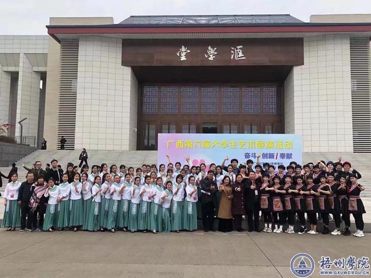 据悉,广西第六届大学生艺术展演由自治区教育厅主办、广西大学承办,广西大学生艺术展演活动三年举办一届,是自治区目前规格最高、规模最大、影响最广的大学生艺术盛会。广西第六届大学生艺术展演由自治区教育厅主办、广西大学承办,我校在此届艺术展演中有舞蹈甲组、声乐甲组、声乐乙组、器乐甲组、器乐乙组、戏剧甲组、朗诵甲组共7个节目参演。