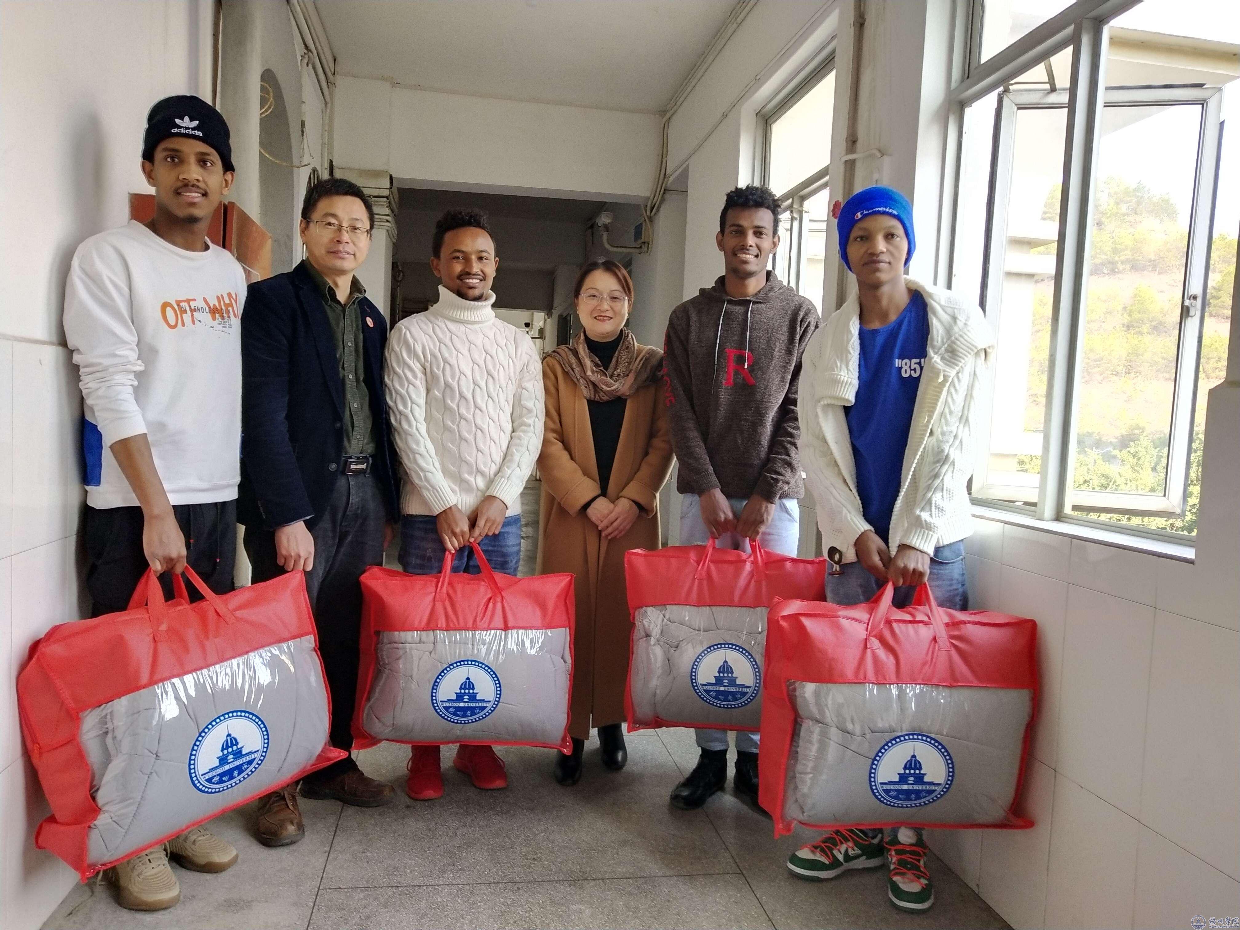 12月25日,我校对生活困难留学生开展“冬日暖阳”关爱活动,学校副校长宾月景来到留学生宿舍慰问,并赠送爱心棉被,鼓励他们安心学习。