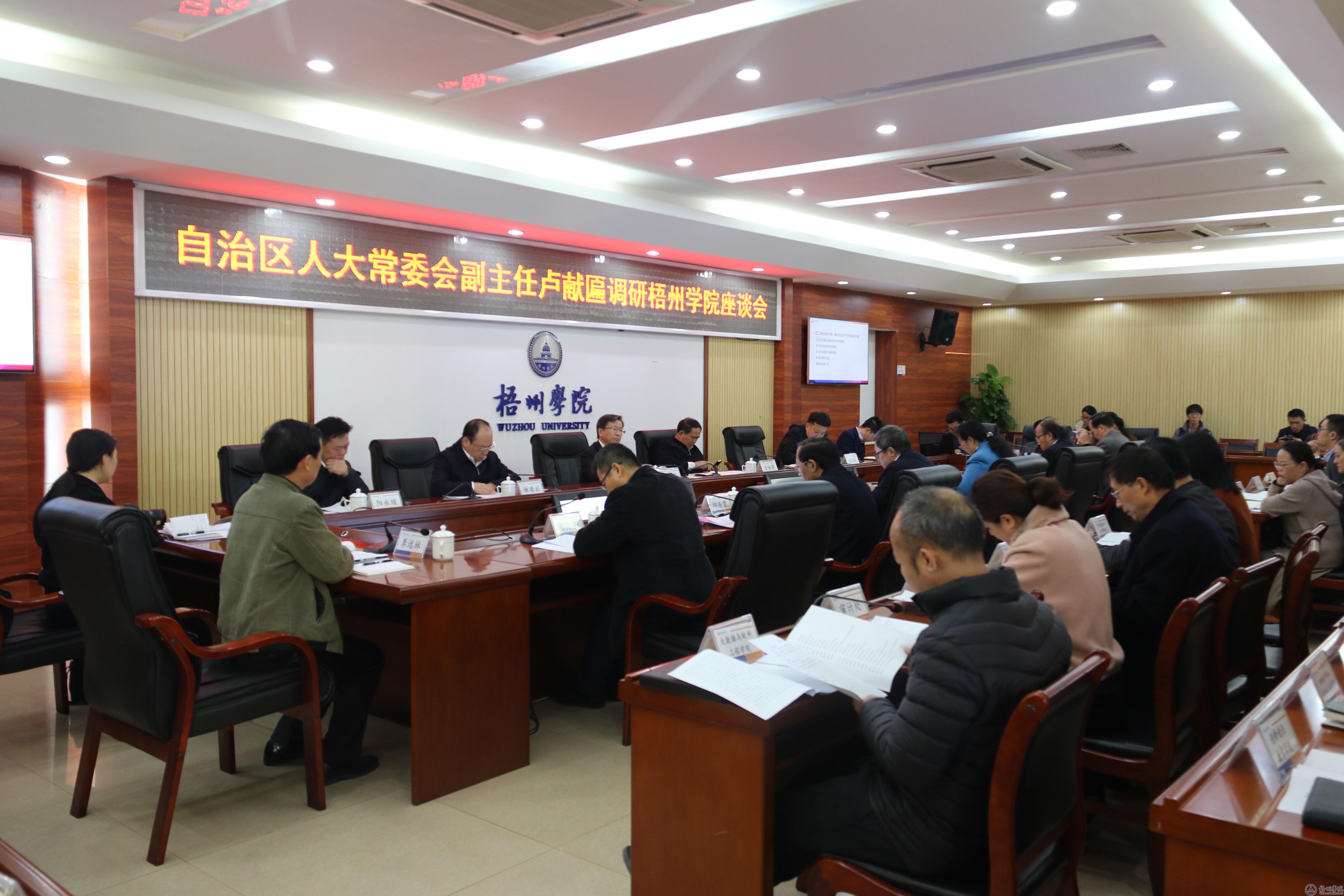 12月4日下午,自治区人大常委会副主任卢献匾到我校调研,指导我校党建和“十四五”规划工作。梧州市委书记全桂寿,市人大常委会主任谢凌云,市委常委、常务副市长吴浩岭,学校领导韦仕珍、杨奔、玉振明、邱房贵、梁业华、宾月景参加了调研活动。 卢献匾首先考察了我校教职工限价商品房、北校区项目一期工程项目的建设情况,随后召开调研座谈会,听取学校工作汇报。 座谈会上,校长杨奔代表学校党委、行政对卢献匾副主任和市领导到校调研指导工作表示感谢,就去年以来我校在疫情防控、党建、思想政治工作、教育教学改革、基础设施建设、学科专业建设、人才队伍建设、依法治校、科研和服务地方等方面的工作情况作了汇报,分析了存在的问题,提出了学校请求自治区人大常委会领导帮助协调解决的相关事项。 在听取学校有关发展情况汇报后,卢献匾对我校去年以来取得的工作成果给予了充分肯定。他指出,我校作为一所发展中的地方院校,面对突如其来的新冠肺炎疫情的影响,学校的各项工作,特别是基础设施建设顺利推进,成绩来之不易。学校要深入学习领会习近平总书记关于办好高等教育的重要讲话精神,认真分析研究,总结提炼学校“十三五”期间的工作经验,增强发展信心;要坚持问题导向,突出目标导向,学习借鉴先进高校经验,找准“十四五”时期学校高质量发展的支撑点。 卢献匾强调,要深入研究中央、自治区党委“十四五”规划部署,认真谋划学校的“十四五”发展工作,争取更多项目纳入全国、全区、全市的发展盘子;要坚持开门问计、集智聚力,做到上下协调、左右沟通,逐步理顺完善办学机制,确保学校“十四五”规划更全面、更具体、更可行;要坚持稳中求进的发展总基调,立足梧州作为广西东大门的区位优势,积极融入粤港澳大湾区,打造更具特色的品牌学科专业,建设东融研究高地,创设干事创业的好平台、好机制、好载体,既充分发挥现有人才队伍、干部队伍的才干,又能聚天下英才而用之,进一步厚植发展优势。 卢献匾就进一步加强我校思想政治理论课建设和课程思政提出了要求。他指出,要深刻认识思政课是落实立德树人根本任务的关键课程,做到思政课教学全覆盖。办好思政课,关键在于建设一支高素质的教师队伍;要全面把握思政课教师队伍建设要求,按照“六要”标准,推动教师转变教学观念、教学态度,切实做到言传要深、身教要真,模范引领学生真学、真信、真用;要采取有力措施推动思政课与专业课程教学的有机融合、相互渗透,全面落实课程思政;要把思政课教学融入梧州经济社会发展,让学生学深悟透、知行合一。 卢献匾表示,作为联系梧州学院的自治区领导,将继续关心支持学校的发展,帮助协调解决学校发展中遇到的困难和问题。他就进一步推进我校北校区项目和教职工限价商品房项目的建设提出了要求:组建北校区项目建设资金筹措工作专班,明确工作分工,保持与上级有关部门、金融机构的沟通和联系,协调资金筹措与项目推进的关系,确保项目顺利推进;教职工限价商品房的建设要依法推进,无风险推进,规范推进,透明推进,争取项目早日建成交付购房教职工使用。 全桂寿书记在讲话中指出,梧州教育事业发展底蕴深厚。长期以来,市委、市政府始终坚持教育优先发展战略,办好梧州学院更是历届党委、政府一直记在心上、抓在手上的重点工作。各级各部门要满腔热忱解决好学院发展急事难事,做到“能解决的马上解决、一时解决不了的研究解决”,全力支持学院加快建设桂东南高层次应用型大学。学院领导班子要坚定信心,大力弘扬“海纳百川、力争上游”新时代梧州精神,心齐气顺科学谋划发展路径,以更务实的作风带好队伍、办好学校、教好学生,助力梧州加快建设广西东大门。 学校党委书记韦仕珍在讲话中表示,卢献匾副主任、全桂寿书记的讲话具有很强的指导性、针对性,充分体现了自治区人大常委会,市委、市人大、市政府对学校发展的高度重视和殷切希望,令人鼓舞,催人奋进,学校领导班子将及时召开会议传达贯彻两位领导的讲话精神。她表示,我校将紧紧围绕国家、自治区、梧州市的“十四五”发展规划,进一步理清工作思路,明确发展定位,加强内涵建设,培育办学特色,为广西加快东融,梧州市建设好东大门做出积极的贡献。 梧州市人大常委会秘书长、办公室主任阳永煊,学校相关单位、部门负责人参加了调研座谈会。 [文:林远 钱静/编辑:于倩/图:朱世滔]