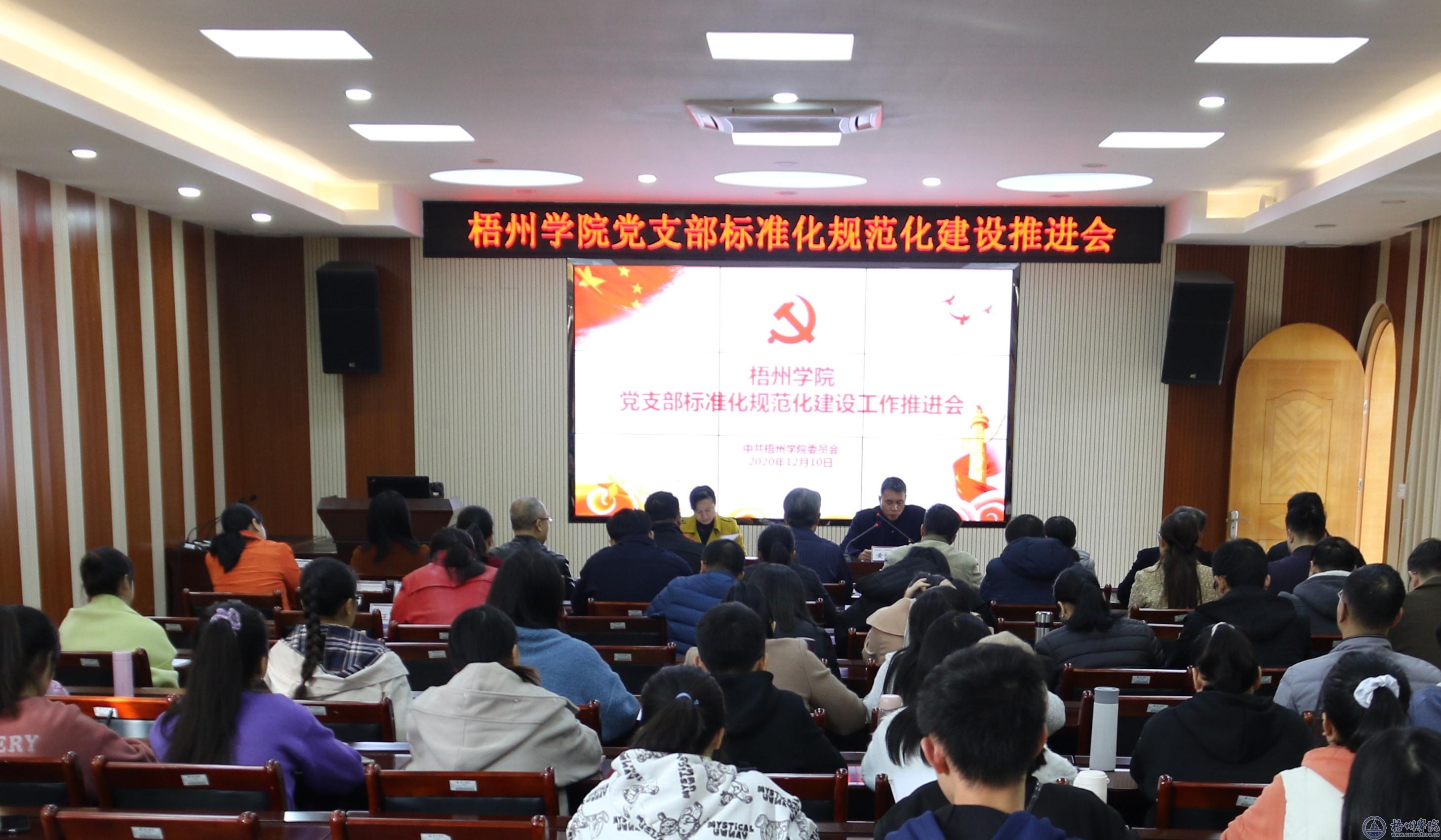 会上,黄健武向在座全体人员传达了党中央、自治区、梧州市深入贯彻党支部工作条例和推进党支部标准化规范化建设有关会议和文件精神,通报了我校2020年各二级学院在党支部建设、发展党员方面的工作情况。