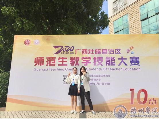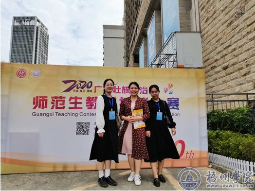 由自治区教育厅主办、广西教师教育学院承办的2020年广西壮族自治区师范生教学技能大赛于11月在南宁举行。来自全区共66所学校400名师范生参加比赛。 我校教师教育学院派出了由杨思毅老师带队、唐苑芸老师随同指导,小学教育专业的孙思琴、黄莹蓉和学前教育专业的唐秦佳美3位参赛选手组成的参赛队伍参赛。经过两天激烈角逐,我校3位参赛选手均表现优异,孙思琴同学获得小学语文组一等奖,唐秦佳美同学获得高校/高职学前组一等奖,黄莹蓉同学获得小学数学组二等奖。