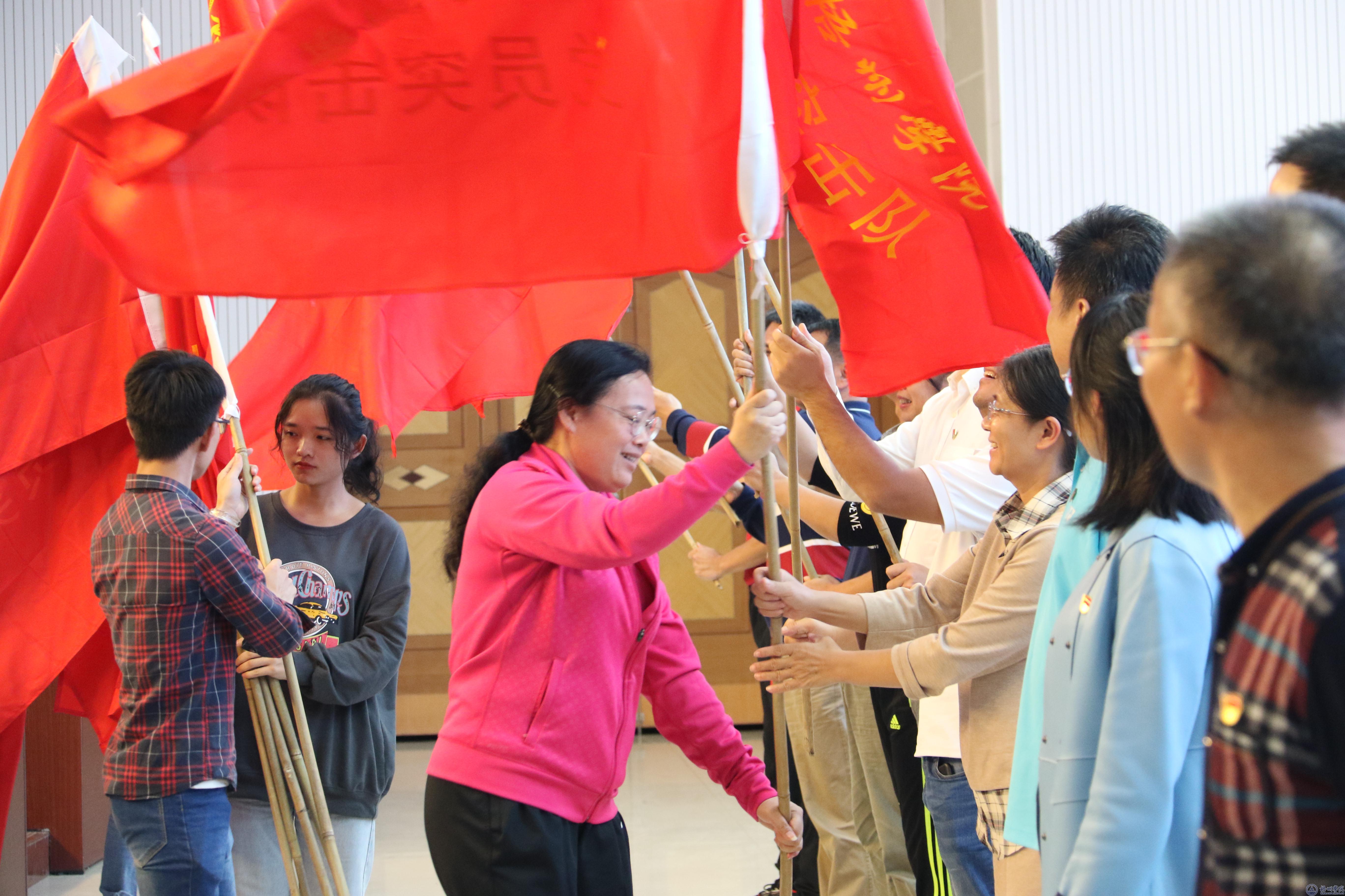 校党委书记韦仕珍作深情动员。她表示,学校的建设牵动着每个教职工的心,“梧院速度”让每个教职工心潮澎湃、倍感自豪,在学校有需要的时候,我们勇挑重担,义无反顾,“我们爱梧州学院,我们就去呵护她,我们就去建设她吧!”动员讲话后,韦仕珍为党员突击队授旗,各二级党委、党总支、直属党支部书记上台领旗。
