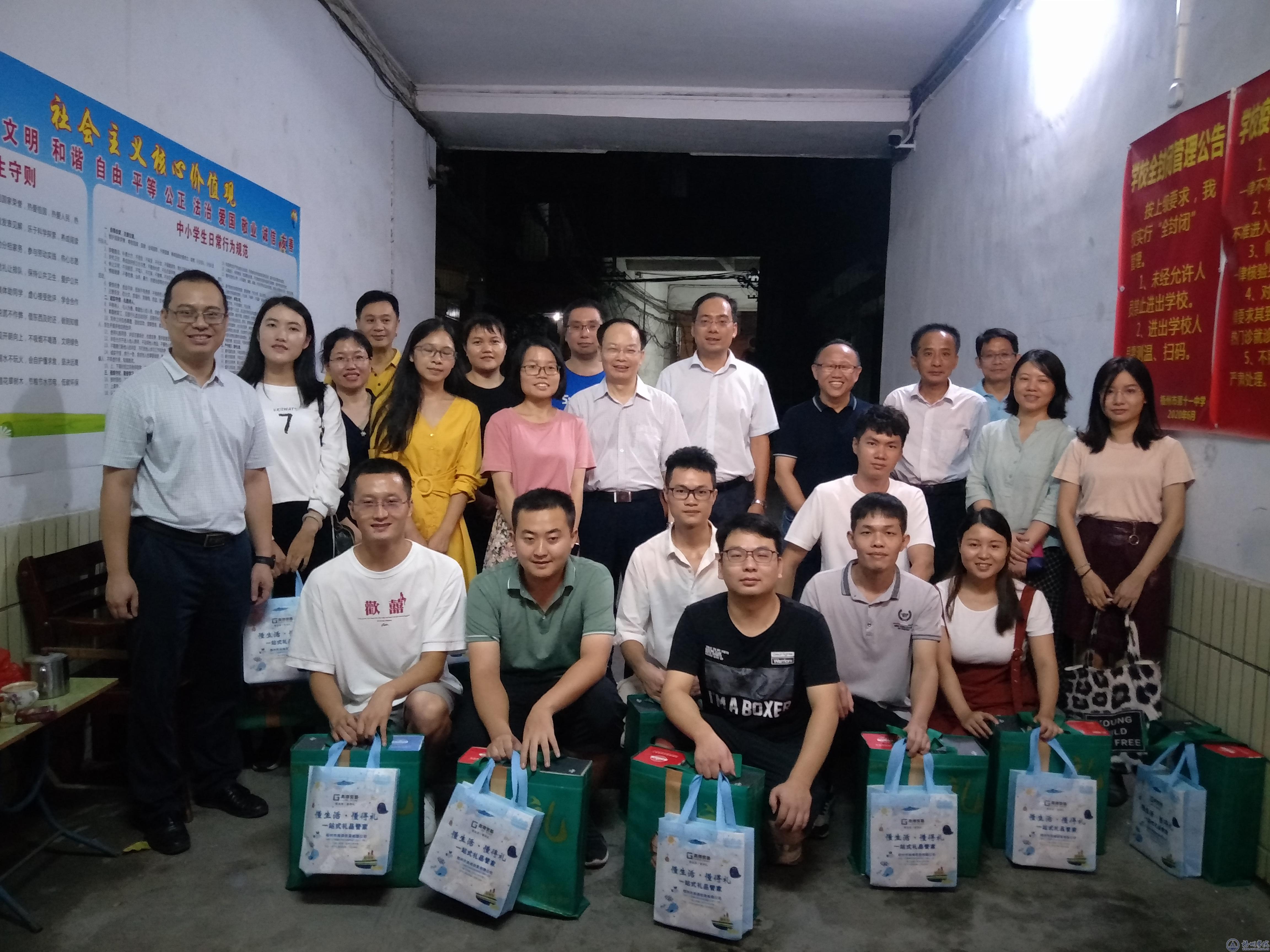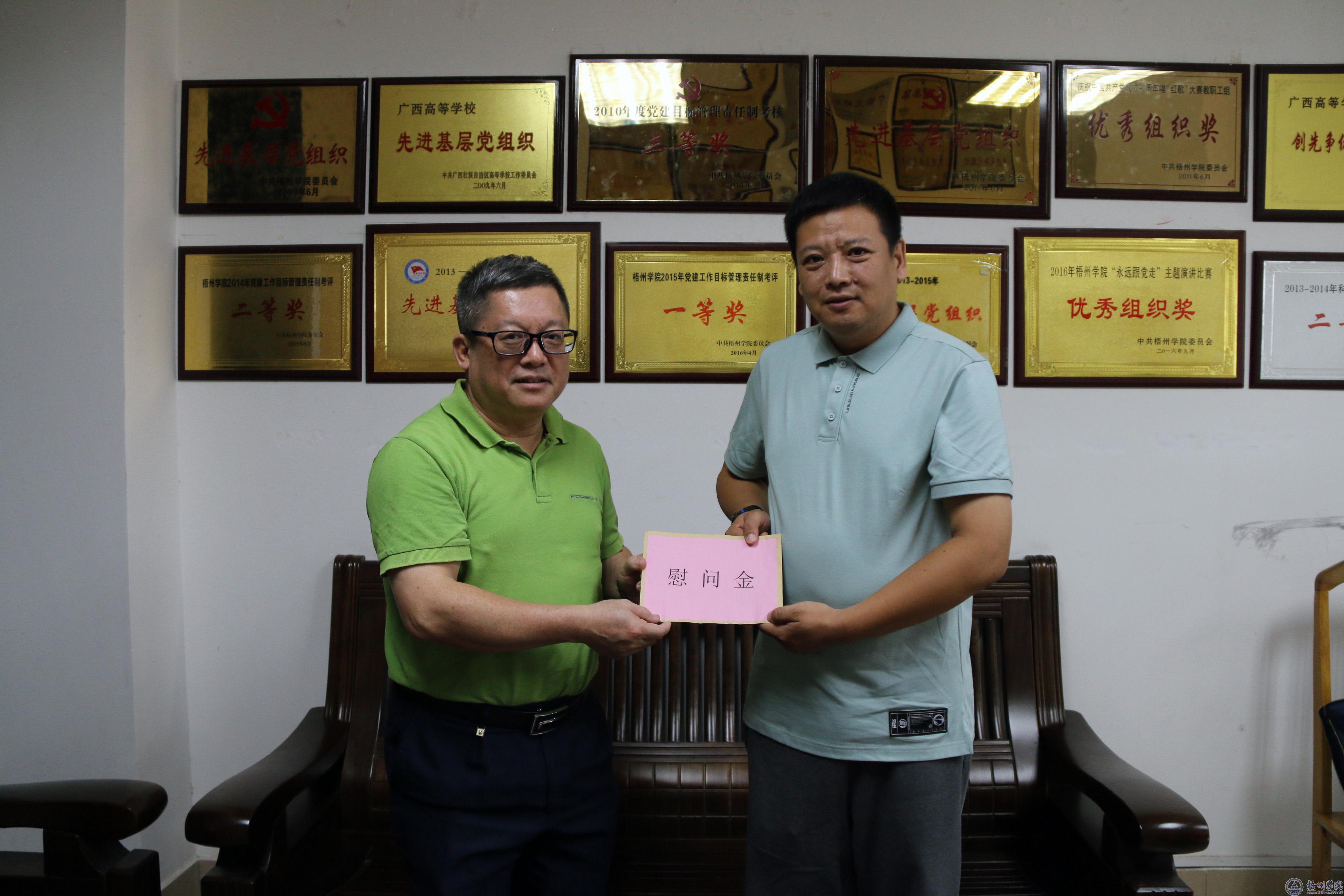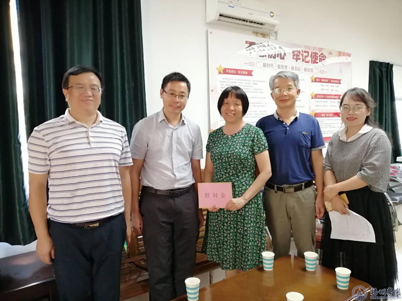 韦仕珍书记(右三)慰问尹杰钦教授(右二)、杨振宇博士(左三)