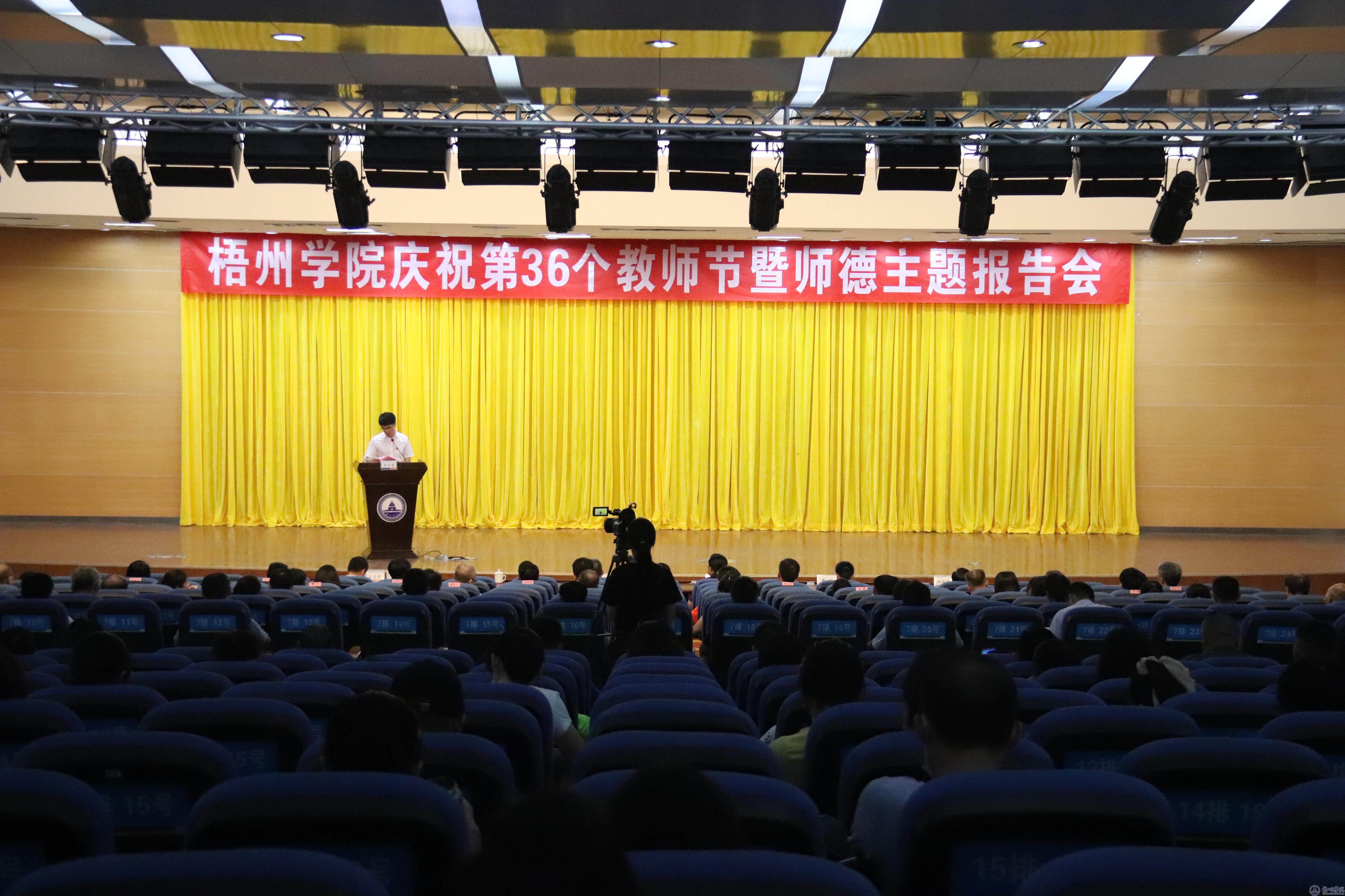 9月10日下午,学校在明理楼一楼学术报告厅召开庆祝第36个教师节暨师德主题报告会。学校领导韦仕珍、杨奔、曹迎、邱房贵、宾月景出席报告会。