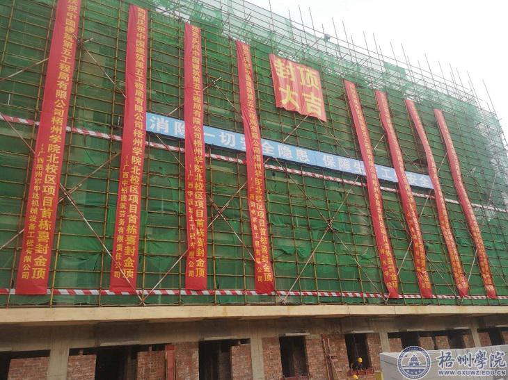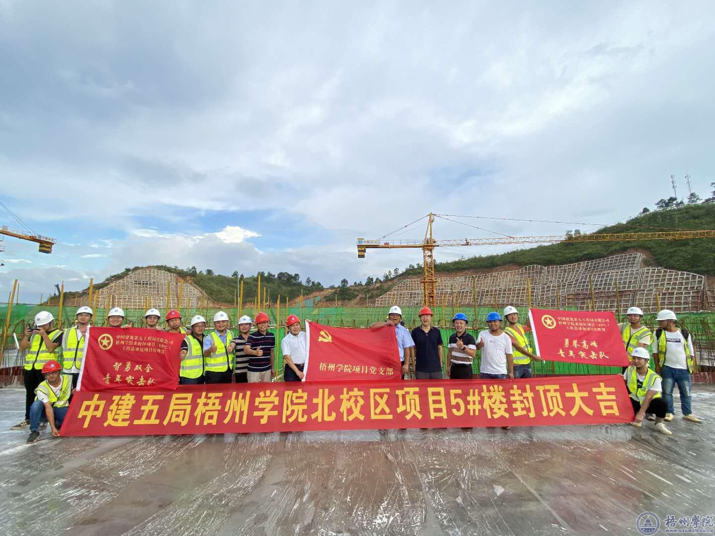 梧州学院北校区建设工程于去年12月31号打下第一根桩,在不到半年的时间内,学校基建攻坚指挥部团队与以中建五局为主的参建各方共同努力,互相协作,想方设法减少疫情和雨季的严重影响,力保工程进度,5号学生宿舍楼终于完成封顶,保证了项目一个重要时间节点。
