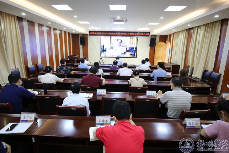 5月22日上午,学校在明理楼分会场参加全区各级各类学校和托幼机构新冠肺炎疫情防控工作视频会议。自治区人民政府副主席黄俊华,自治区党委教育工委书记、教育厅厅长唐咸仅出席会议。学校领导唐平秋、杨奔、邱房贵、梁业华、麻新纯、宾月景,学校新冠肺炎疫情防控工作领导小组指挥部全体成员及疫情防控领导小组指挥部下设各组组长参加会议。