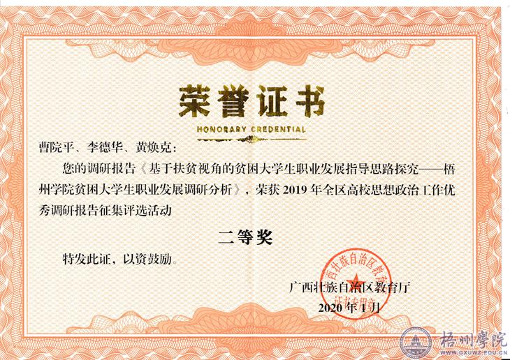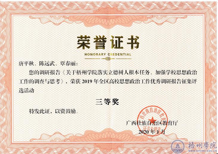 为深入贯彻落实全国全区教育大会、全国全区高校思想政治工作会议精神和学校思想政治理论课教师座谈会精神,进一步加强高校思想政治工作,自治区教育厅组织开展了全区高校思想政治工作优秀调研报告征集评选活动。我校选送的2篇调研报告获奖,曹院平、李德华、黄焕克撰写的《基于扶贫视角的贫困大学生职业发展指导思路探究---梧州学院贫困大学生职业发展调研分析》获二等奖;唐平秋、陈远武、覃春丽撰写的《关于梧州学院落实立德树人根本任务、加强学校思想政治工作的调查与思考》获三等奖。 据悉,本次优秀调研报告征集评选活动有全区43所高校199篇调研报告参加评选,共评选出一等奖10篇、二等奖40篇、三等奖60篇。