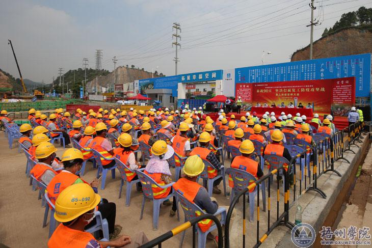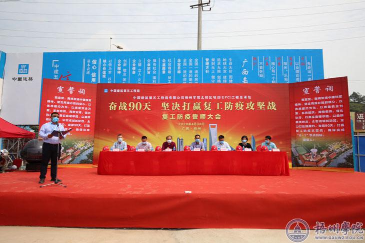 4月30日上午,中建五局梧州学院北校区项目举行“超英杯”劳动竞赛暨奋战90天坚决打赢复工防疫攻坚战誓师大会。大会旨在凝聚力量,调动项目参建各方的积极性、主动性,抢抓工程质量和进度,确保按期按质交付北校区一期工程。梧州市总工会副主席李灿培,学校副校长玉振明,中建五局广西公司副总经理刘世华等相关单位负责人出席会议。