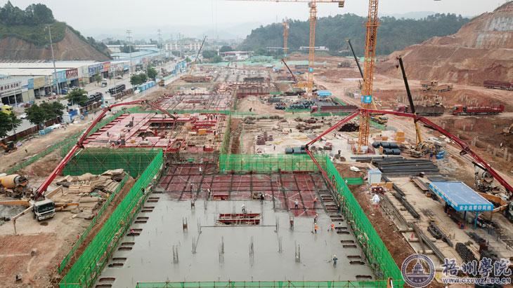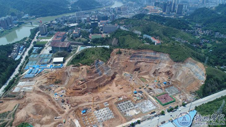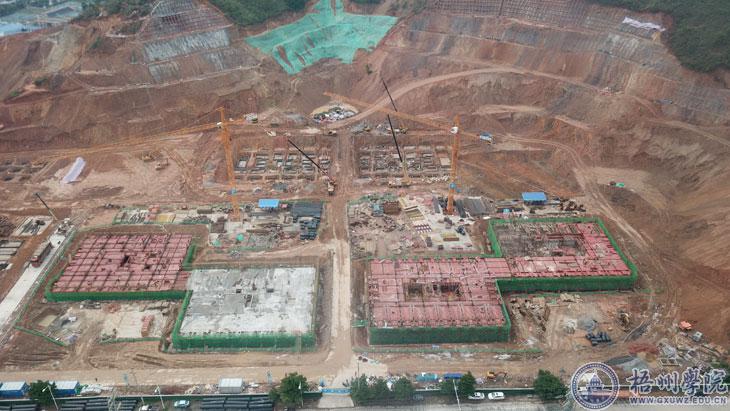 项目自2019年12月31日打下第一桩开始,工地地貌呈现日新月异变化。目前在施工的一期工程主要的建筑是2#食堂综合楼、3#至6#四栋学生宿舍楼,其中所有楼栋均已完成桩基施工,2#食堂综合楼已完成北楼的基础与底板混凝土浇筑,南楼的基础正在施工,3#学生宿舍楼已完成至地下室顶板,4#学生宿舍楼西单元已完成地下室基础开挖及垫层施工,东单元地下室开挖已完成50%,5#学生宿舍楼已完成第二层主体施工,正在进行第三层的主体施工,6#学生宿舍楼正在进行基础施工。同时,主体建筑附近的山体边坡治理工程开展支护施工,已经完成约30%的工程量。